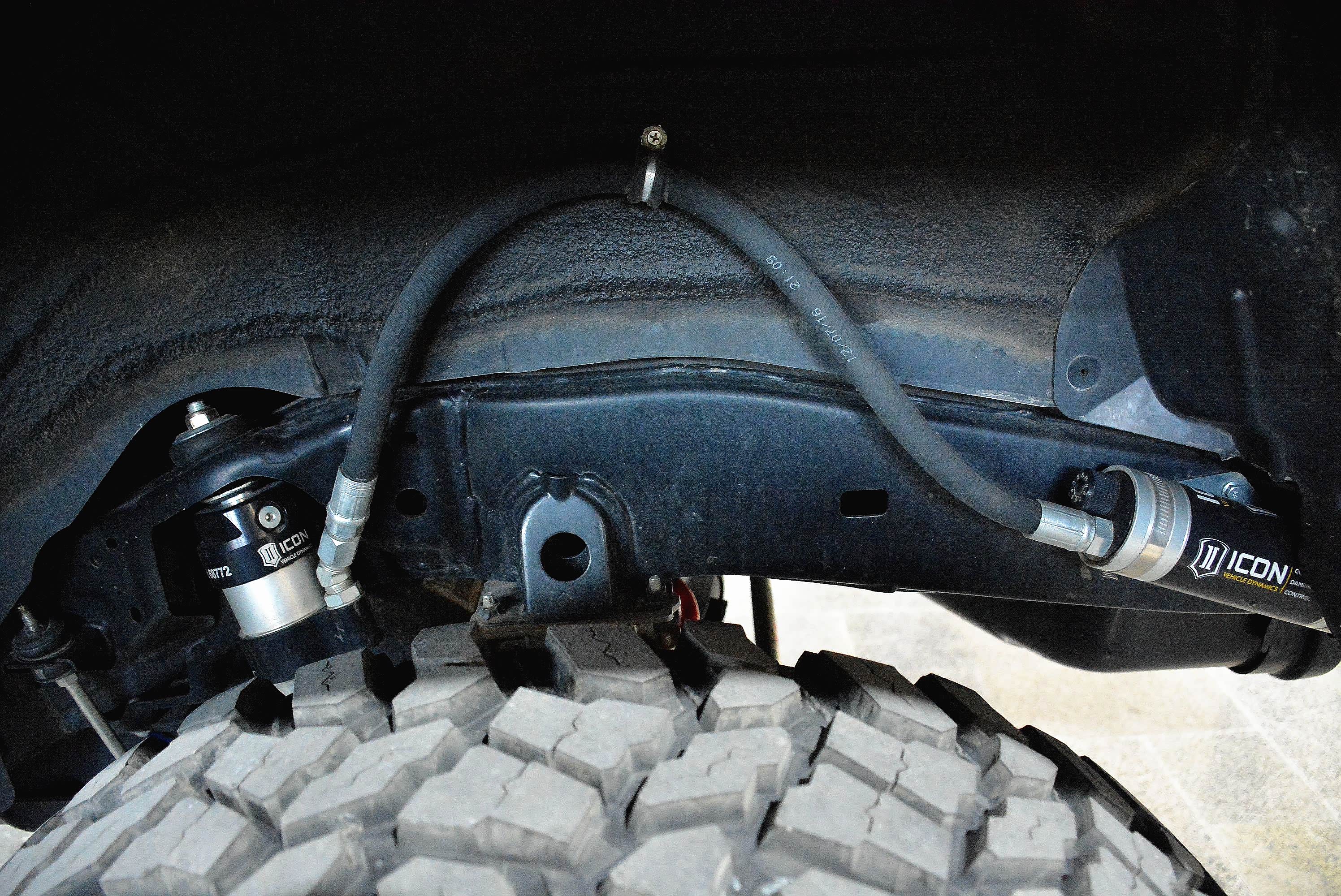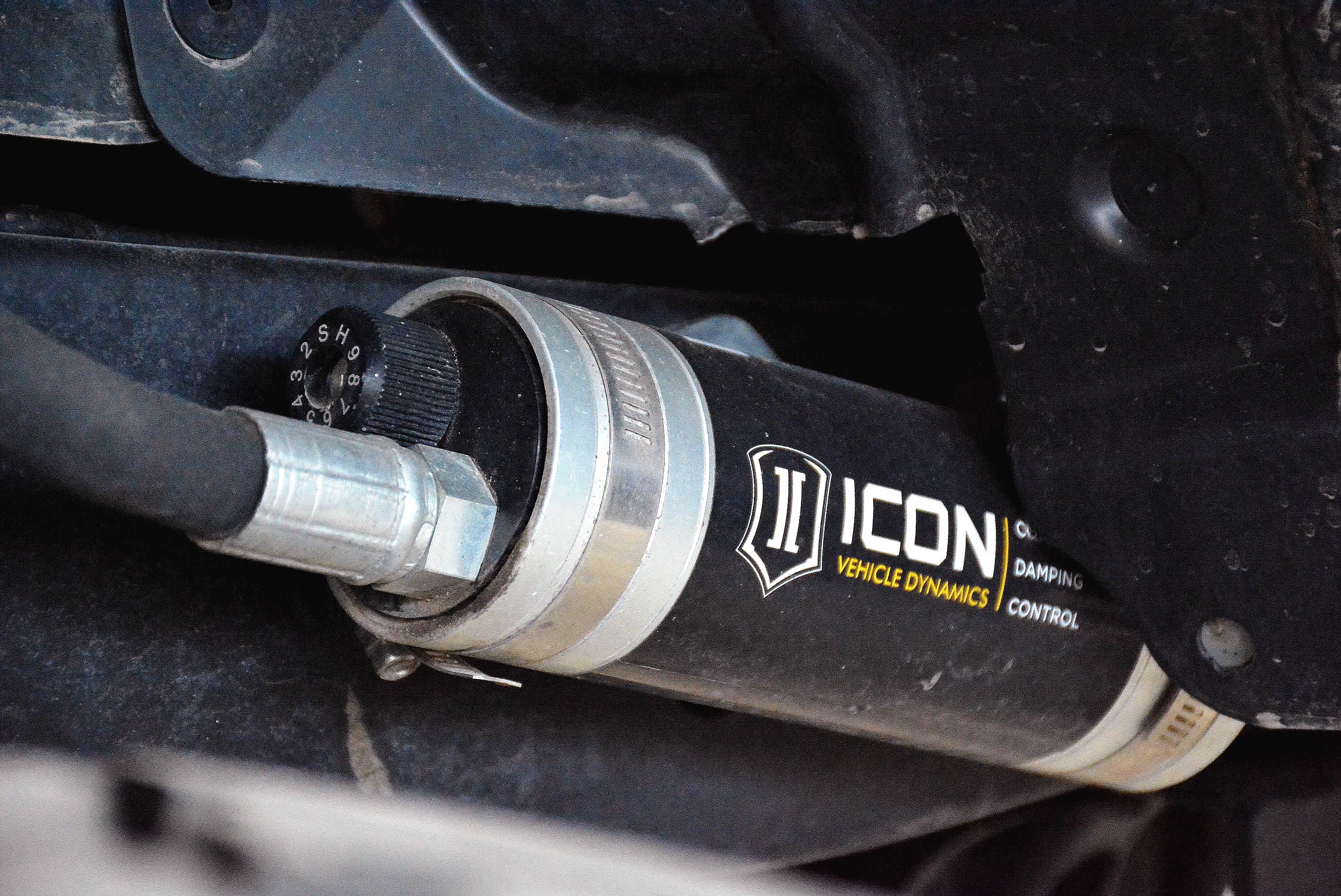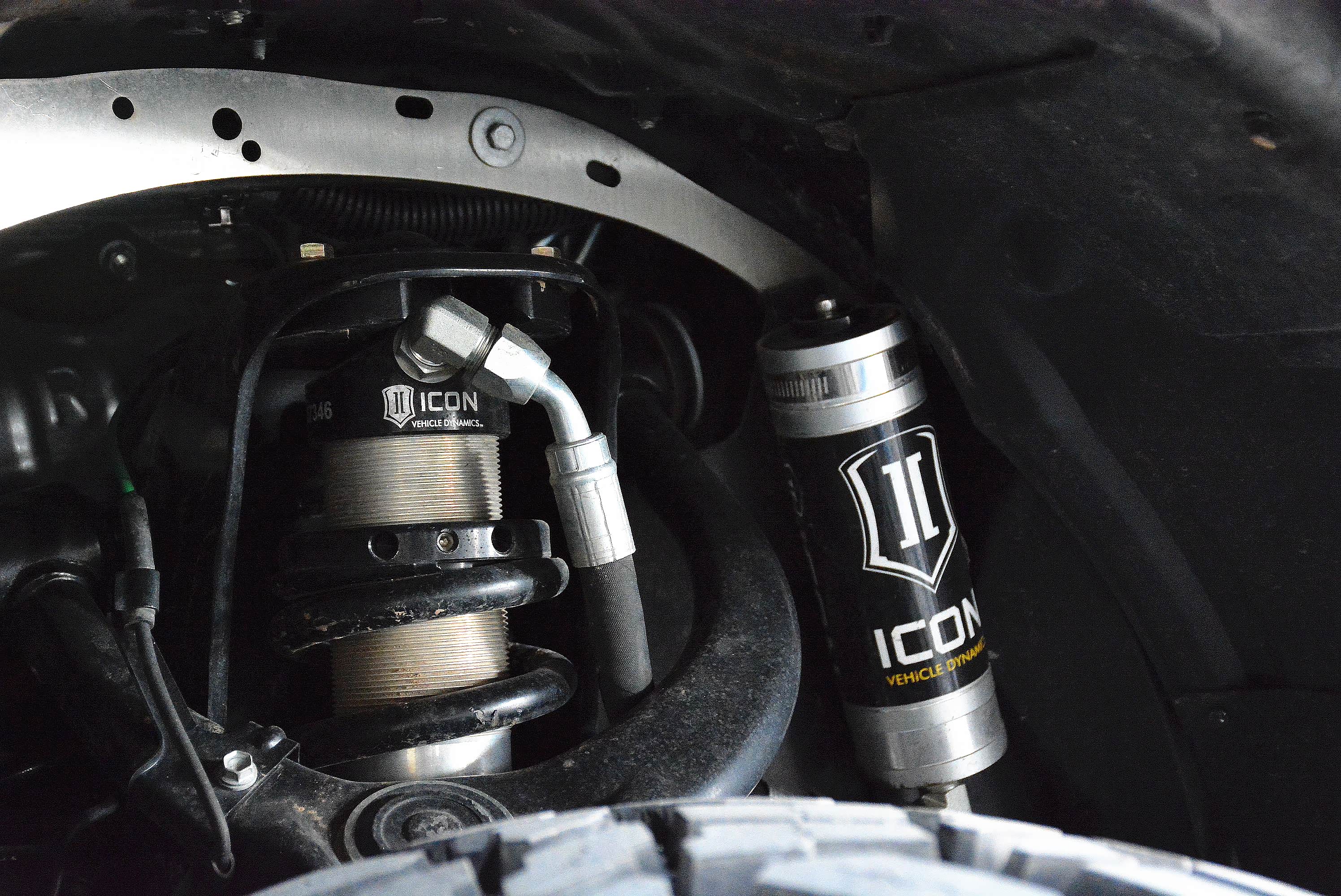 悬挂升高选用的是ICON的两寸升高套件,前减震器为绞牙结构氮气减震,后减震器可以9段软硬度调节。高端货哦,价格自然不菲,但是性能完全对得起它的价格。改装减震器的时候,羊角、支臂、轮眉内衬和轮旋也做了加固处理。FJ的越野功能改装,这些加固是非常有必要的。