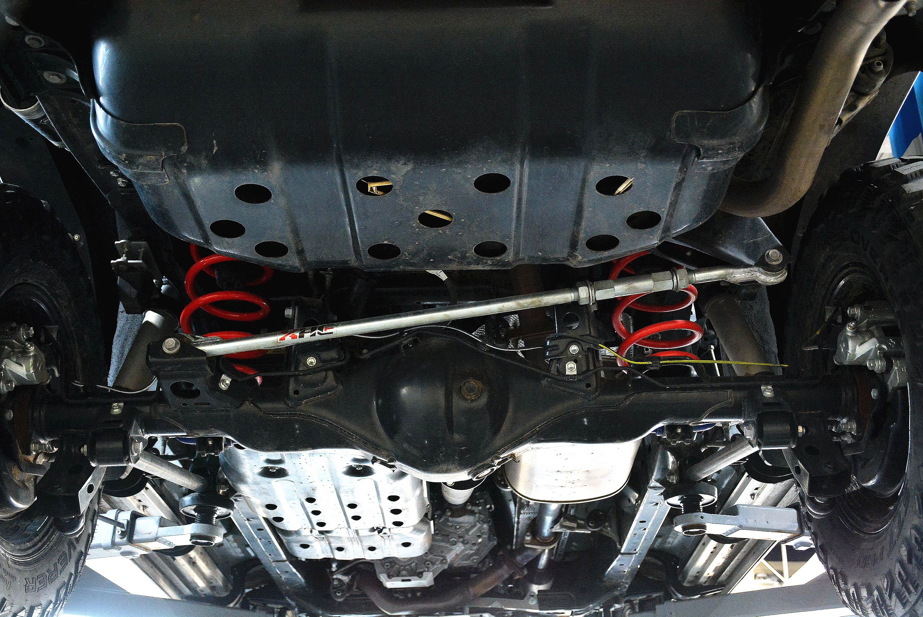 FJ后悬挂为整体桥结构,同样进行了2寸升高,并且更换了加强可调止推杆,所有整体桥结构的车型,升高必须通过止推杆调整桥左右位移。改装过程中不容忽视!