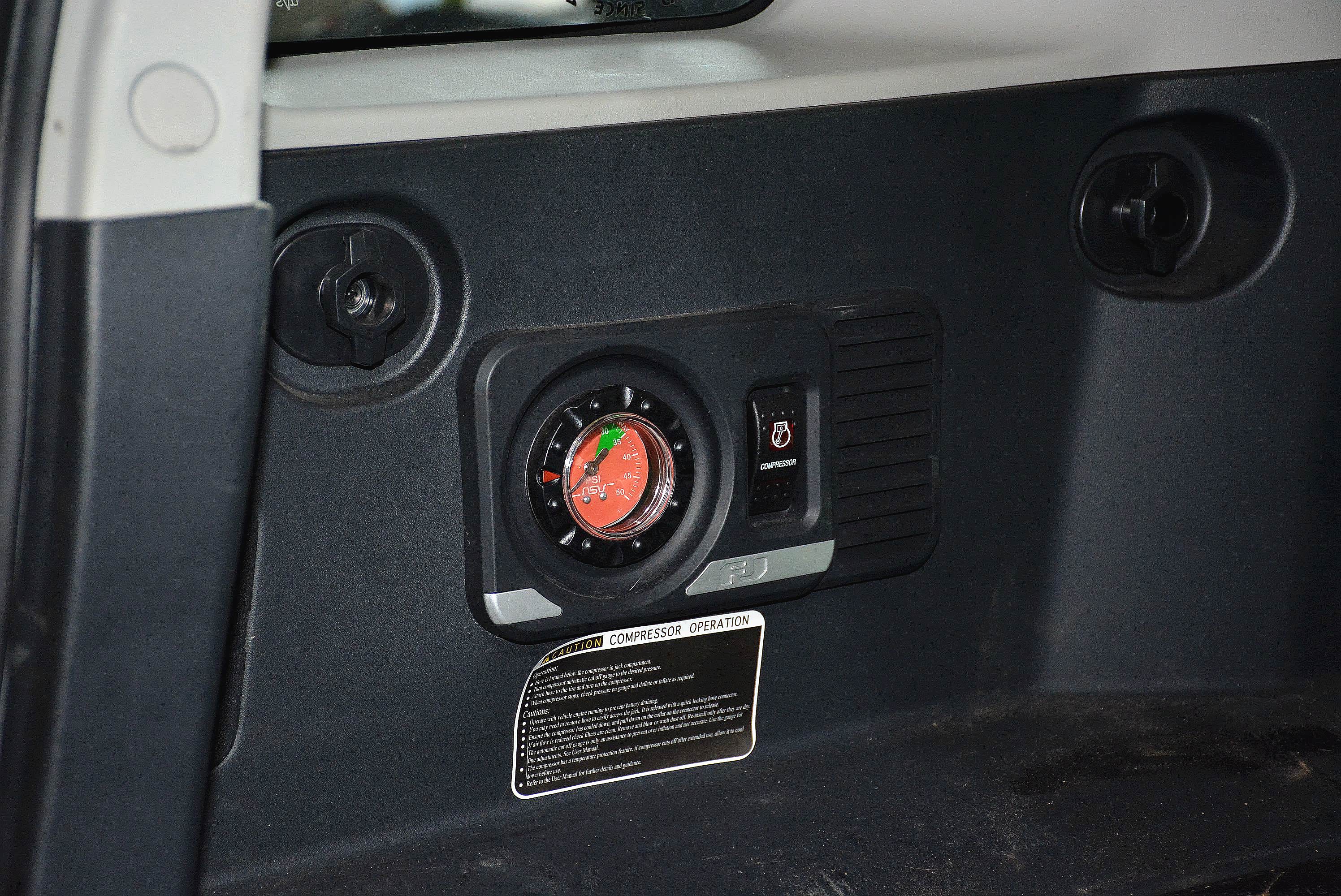 最后,要隆重介绍的是这台FJ是气泵版,原车带气泵哦。后备箱左侧配有气泵及开关,下面盖板打开里面有气管,可以同时为两个轮子打气。就是速度实在是太慢了。不过这个气泵有自动关停功能,通过气压表上面的旋钮,可以选择关停气压,压力到了自动停止。原厂的就是高级昂。