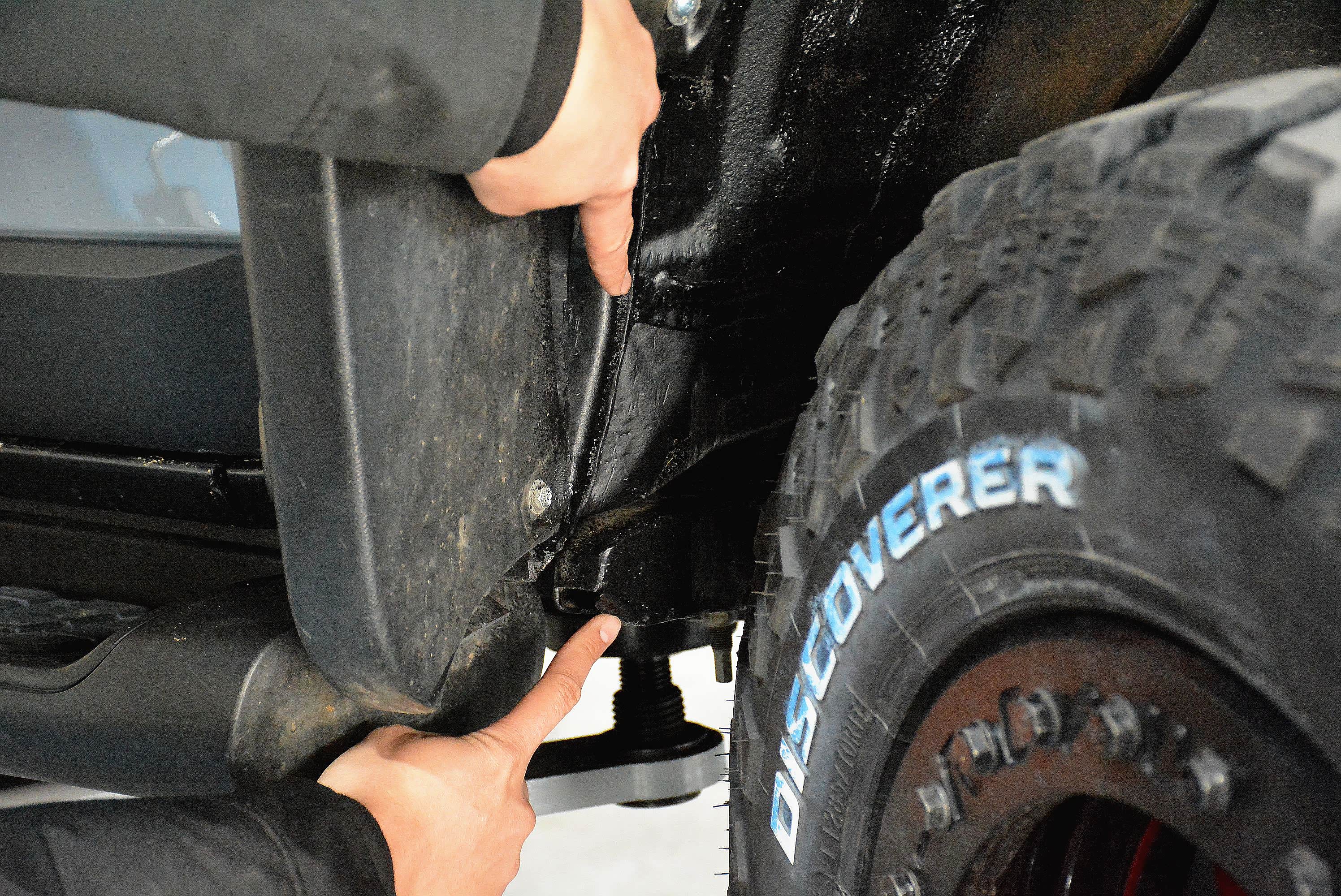 因为换装了285尺寸的轮胎,前轮后面的大梁支架和内衬板有些碍事,保证坚固的前提下该切就切。话说,上了285的轮胎,整车视觉效果明显不一样。