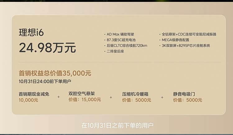 尽管理想i6只推出了一款售价为24.98万的车型,但它展现了极高的诚意。在限定的时间内,我们提供高达3.5万元的免费配置,并直接给予1万元的现金折扣,这种大规模的促销活动在同类车型中实属罕见。基础车型配备了AD Max智能辅助驾驶、二排皇后座、CDC可变阻尼减震器和5C超充等高端配置,使消费者能够享受到远超售价的豪华体验。