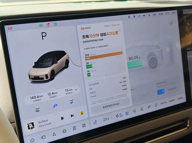 这次试驾过程中我们在理想5C超充桩做了一个简单的补能测试,理想i6双电机四驱版从15%的电量充电到80%只用了10分钟、换算成CLTC里程是431公里,其中开始五分钟功率可以跑到420kW,后面则是可以维持在250kW左右,充电效率非常高。