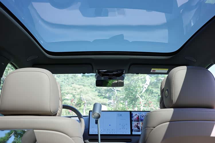 这种通透感首先来自于巨大的全景天幕,同时还有低水切的设计,而且前排三角窗也能减少侧向视野盲区。如果选择全景天幕的版本,那么全车玻璃面积多达6.76平方米,理想表示远超同级。
