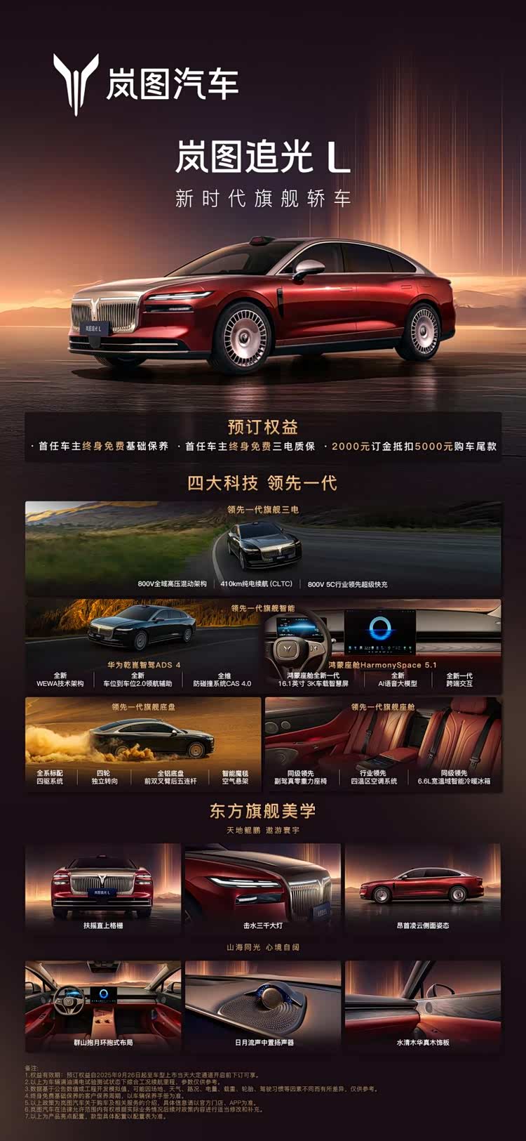 【2025年9月26日 上海】9月26日晚,岚图汽车在与抖音、费加罗FIGARO联合举办的“天地鲲鹏 万象新生——时代风尚之夜”盛典上,隆重推出了岚图追光L。在这场视觉盛宴上,岚图追光L展现了东方美学与现代科技的完美融合,同时也突破了传统豪华轿车市场形成的固有壁垒,重塑豪华轿车新市场;段奕宏作为岚图汽车的品牌挚友,也来到了现场与岚图追光L互动。当晚,岚图新时代旗舰轿车——岚图新时代旗舰轿车--岚图追光L正式开启预订,推出包括2000元订金抵扣5000元尾款,两大终身免费权益等多重尊享权益。展车将于近期陆续到店,用户可以进店亲自体验新车的独特魅力。