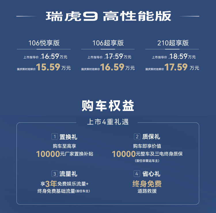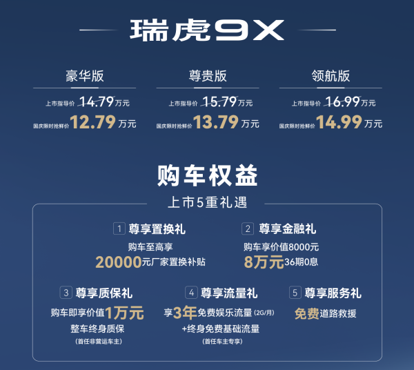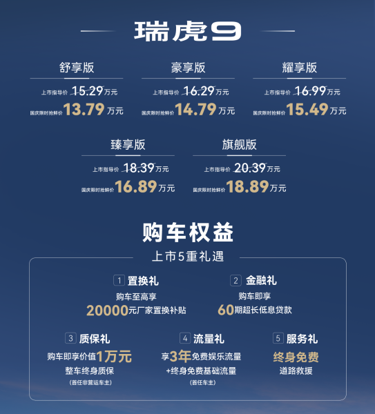 最近, 瑞虎9(参数|询价)家族推出了新款的瑞虎9和瑞虎9X。瑞虎9总共发布了5种不同的车型,其官方推荐的价格范围是15.29-20.39万元,而国庆的限时抢鲜价则在13.79-18.89万元之间,但可以享受1.5万元的优惠;瑞虎9 C-DM插混版包括三种不同的车型,其官方推荐的价格范围是16.59-18.59万元,而在国庆节的限时抢鲜价则是15.59-17.59万元,其中1万元可以享受优惠;新推出的瑞虎9X车型总共有3种,其官方推荐的价格范围是14.79-16.99万元,而国庆的限时抢购价格则是12.79-14.99万元,其中包括2万元的优惠。