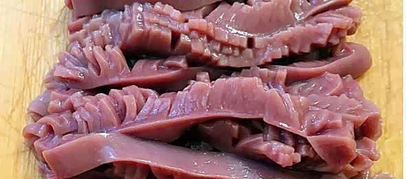 ▲将买回来的腰花放入清水中,轻轻冲洗表面的血水和杂质。然后把腰花平放在案板上,用刀将其从中间对半切开,去除里面白色的筋膜。这层筋膜是骚味的主要来源之一,务必剔除干净。