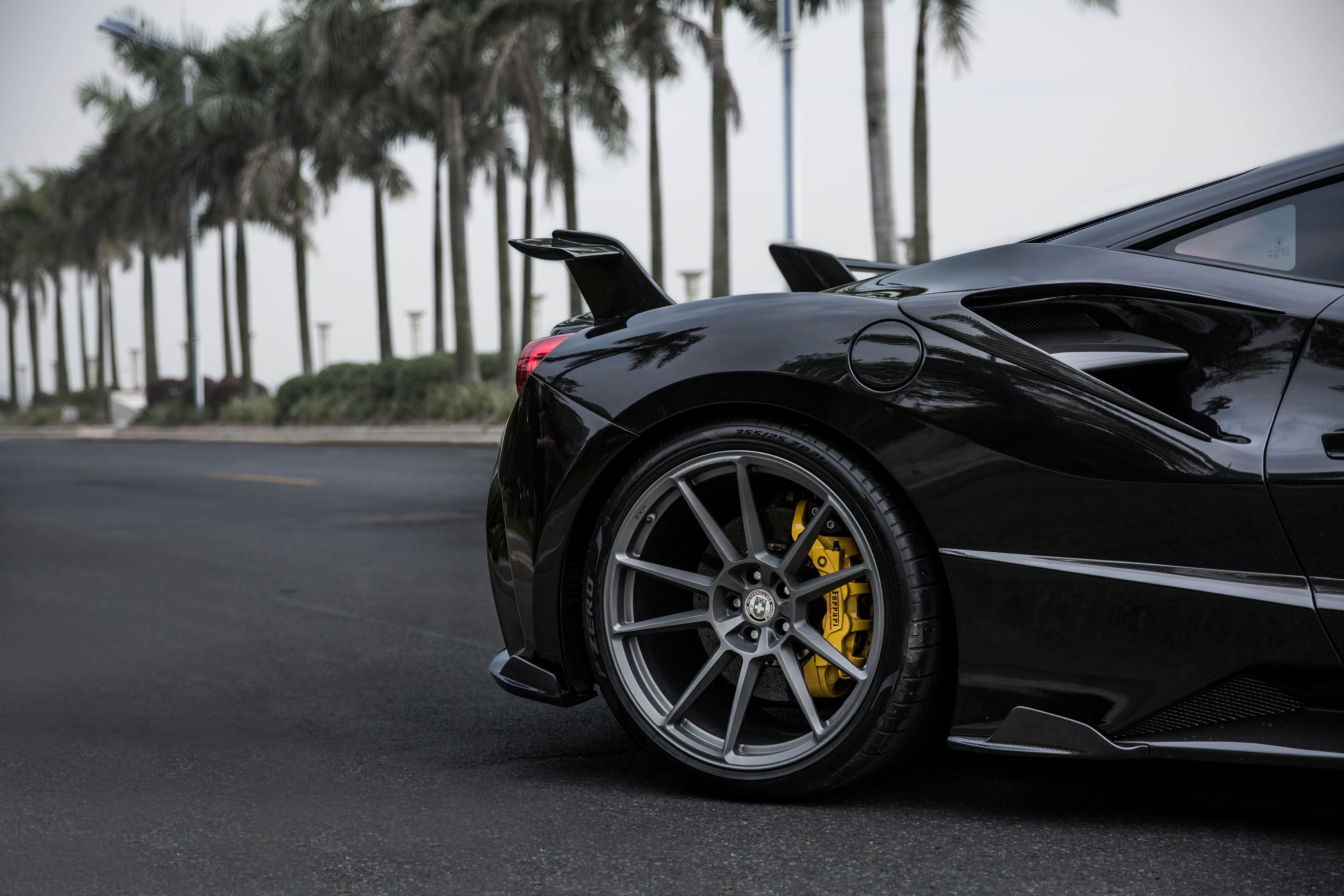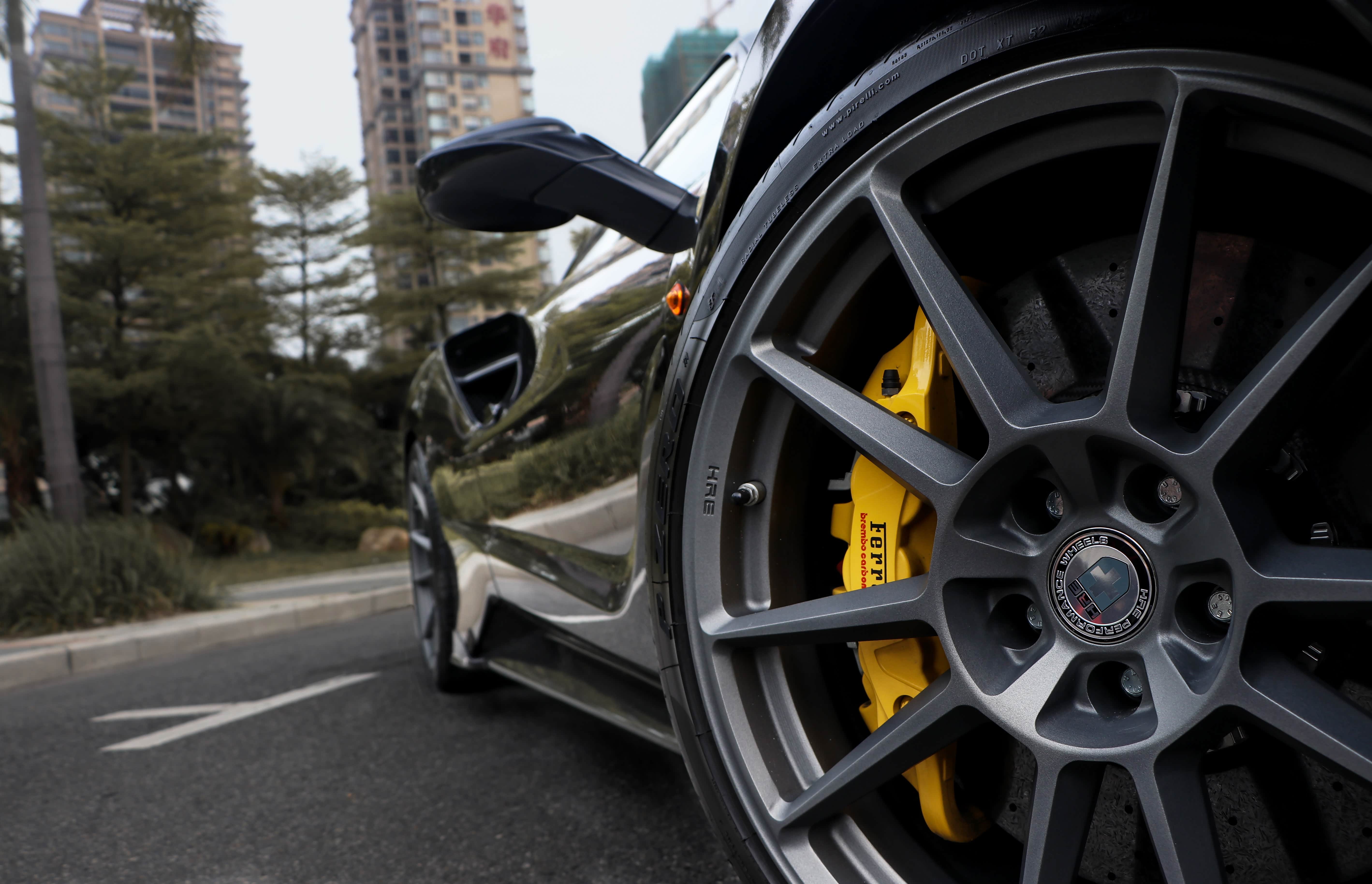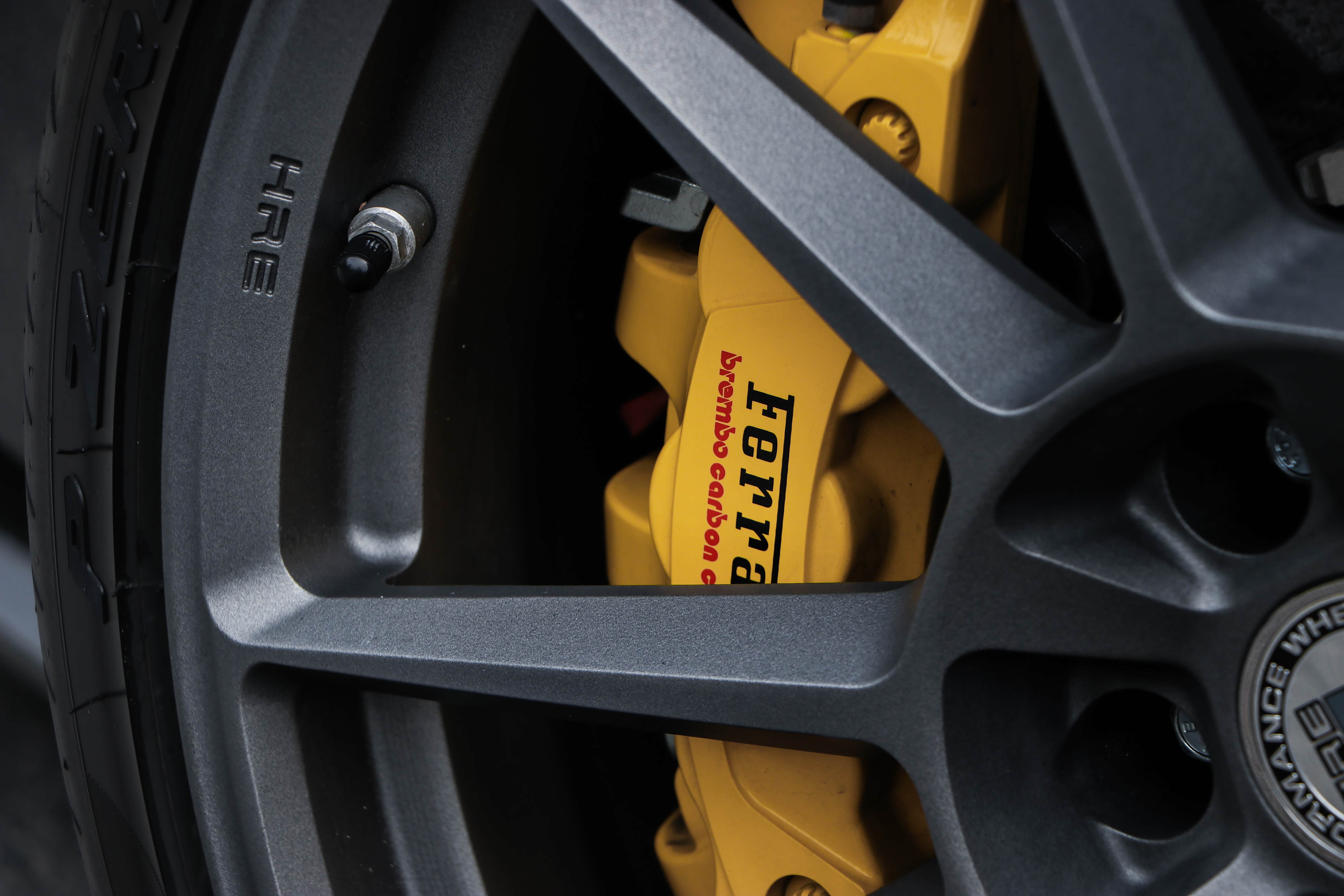 新世代的超级跑车往往都会搭配碳陶刹车,所以法拉利这套原厂的制动系统也已经够用了。不过呢,原厂的轮毂容易在路上"撞衫",作为一辆改装车当然要选择一套新鞋子啦。
