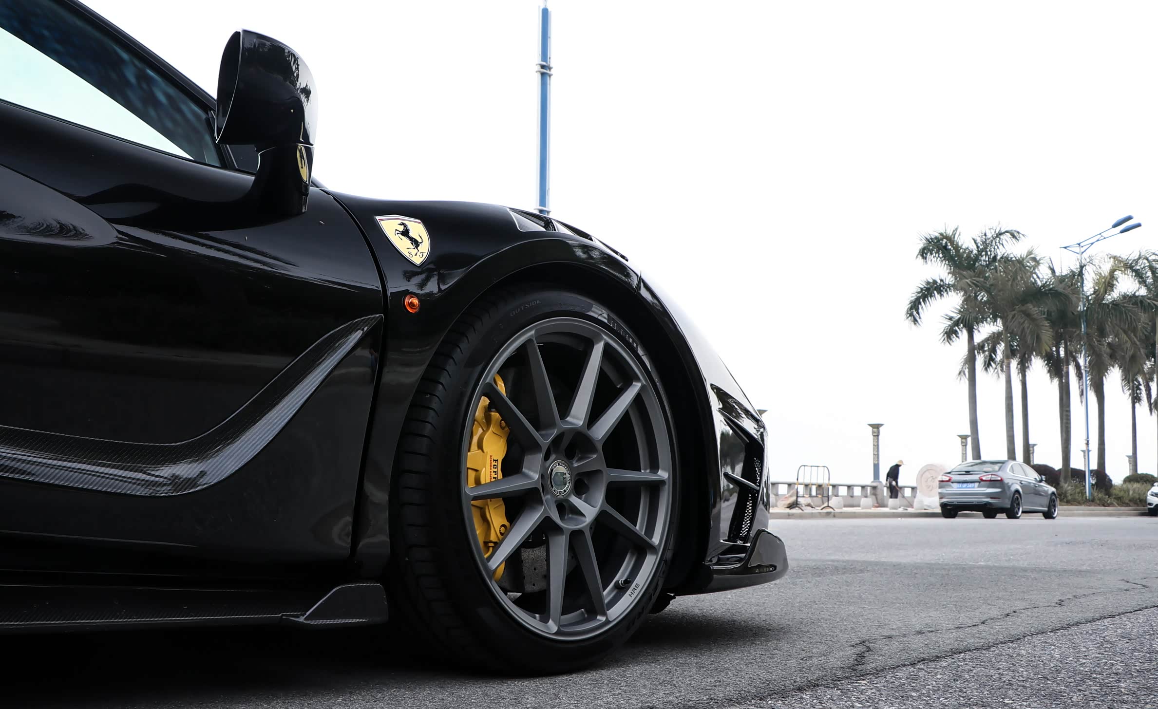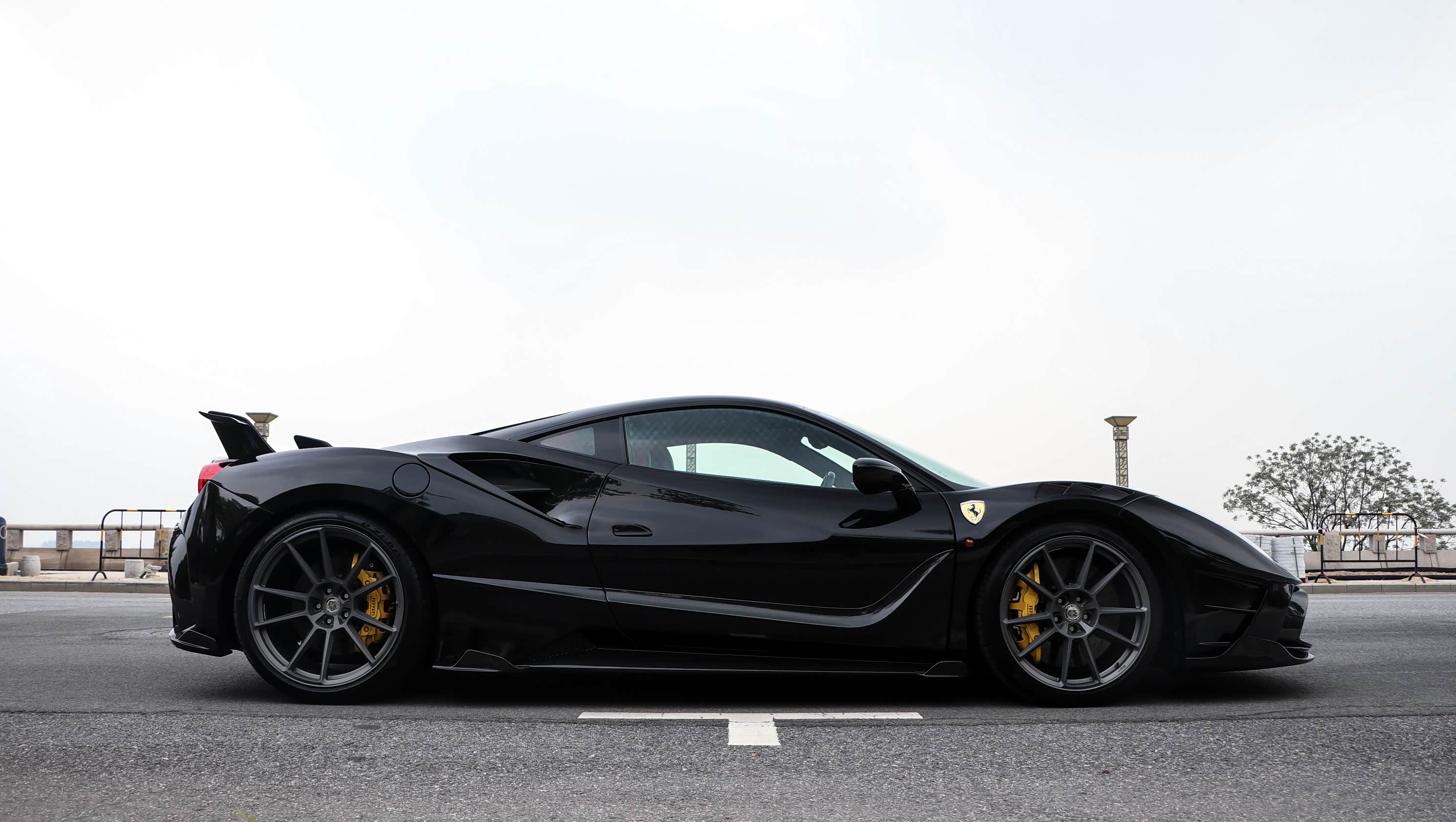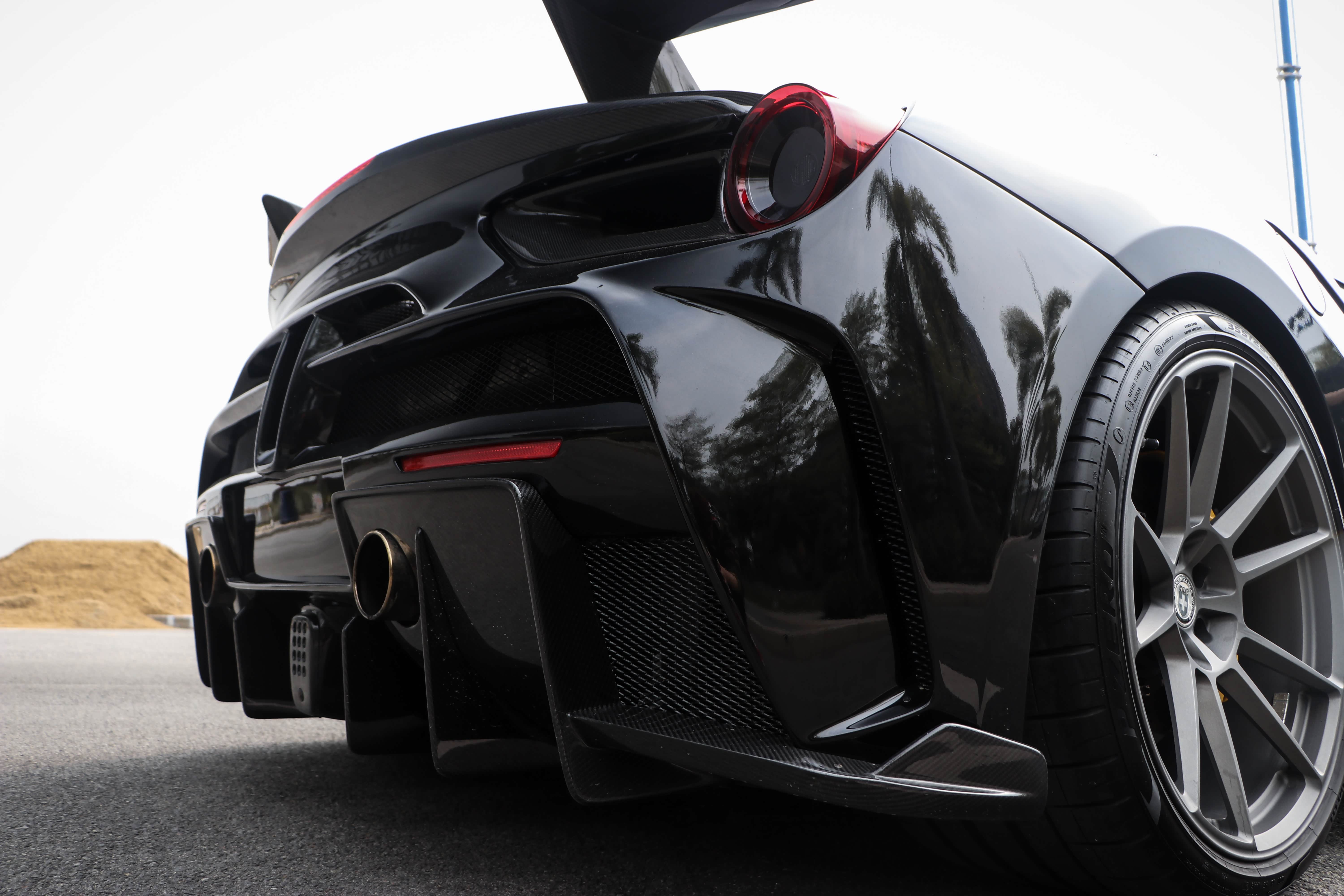 新世代的超级跑车往往都会搭配碳陶刹车,所以法拉利这套原厂的制动系统也已经够用了。不过呢,原厂的轮毂容易在路上"撞衫",作为一辆改装车当然要选择一套新鞋子啦。