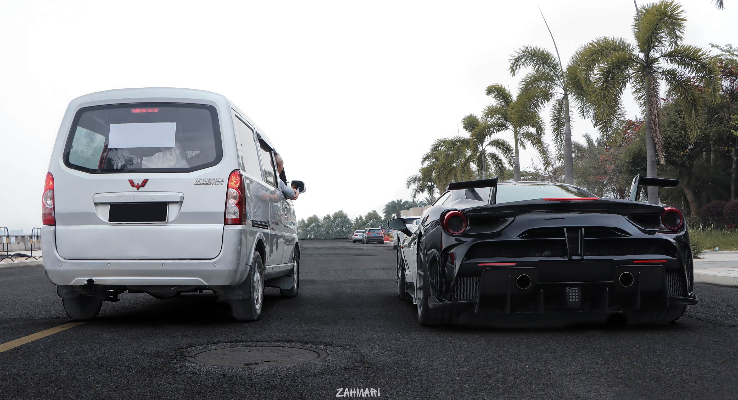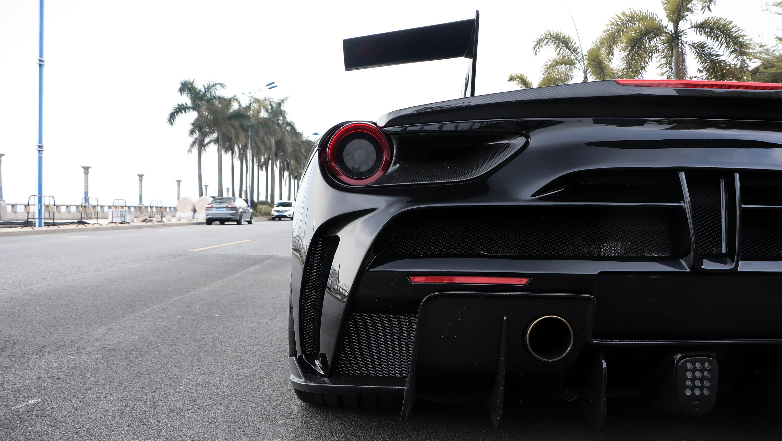 车尾部分和车头一样,被完全替换成了碳纤维的配件。但是为了不影响整体的美观性,只是在扰流板等处保留了碳纤维的原色。