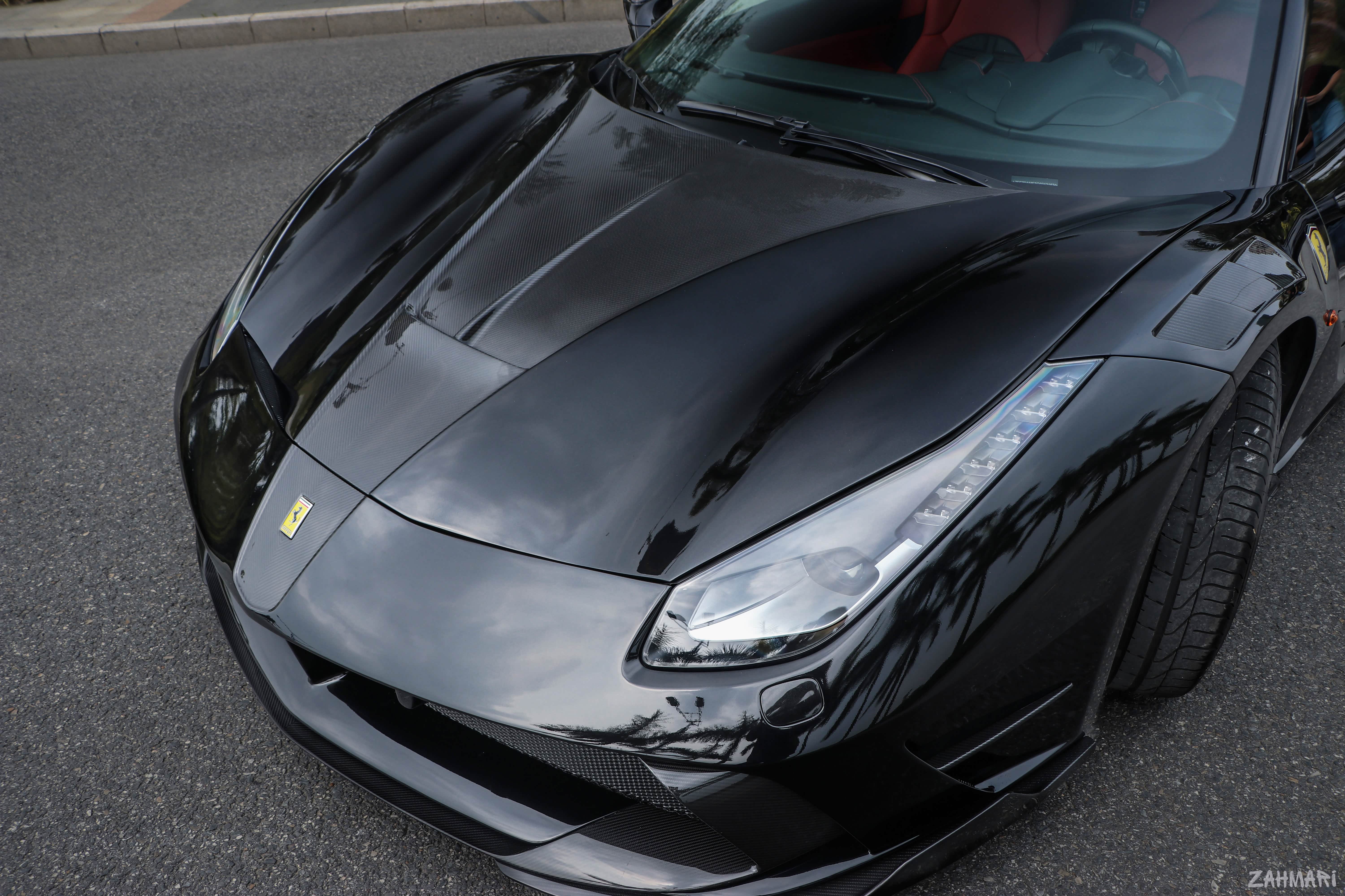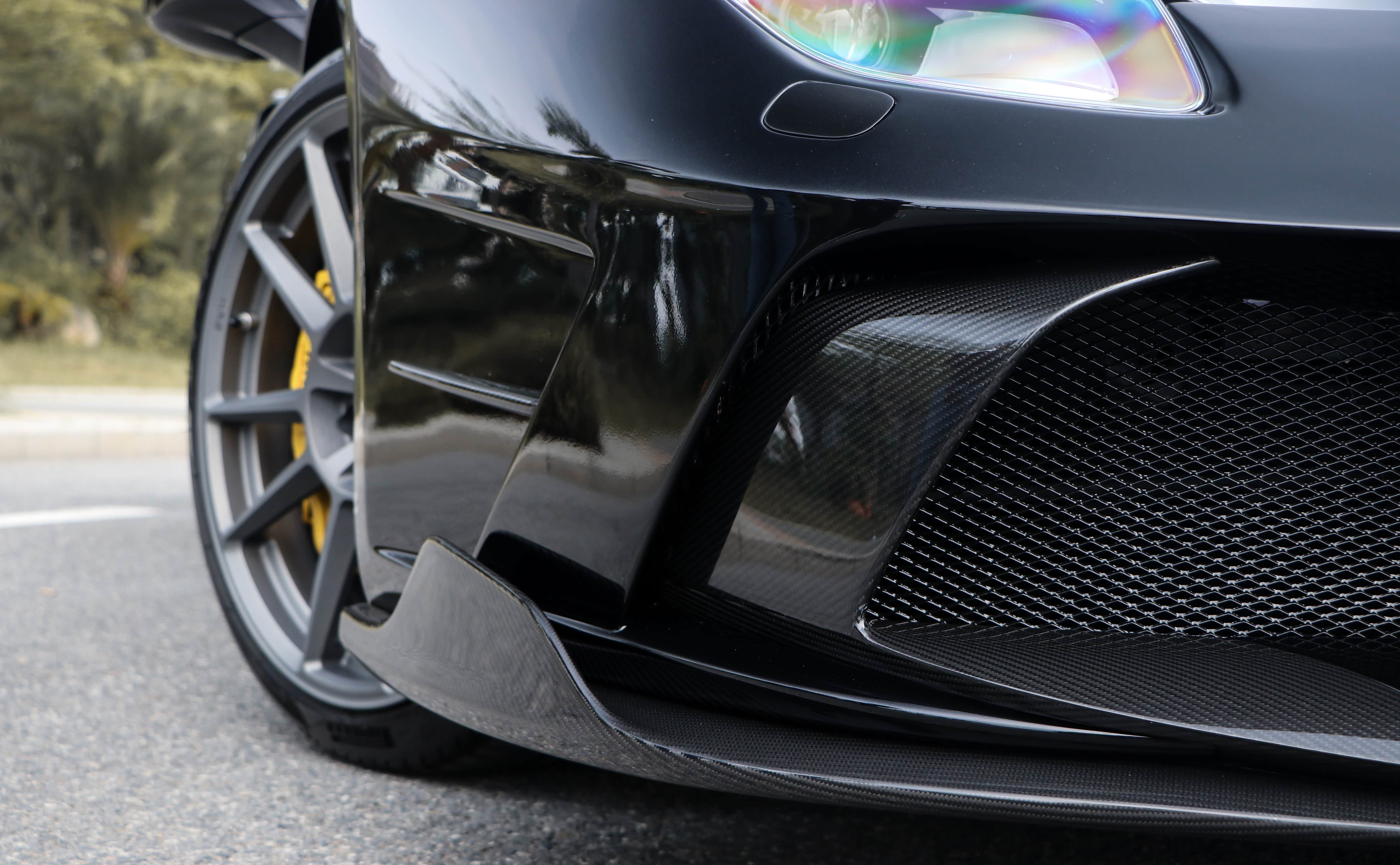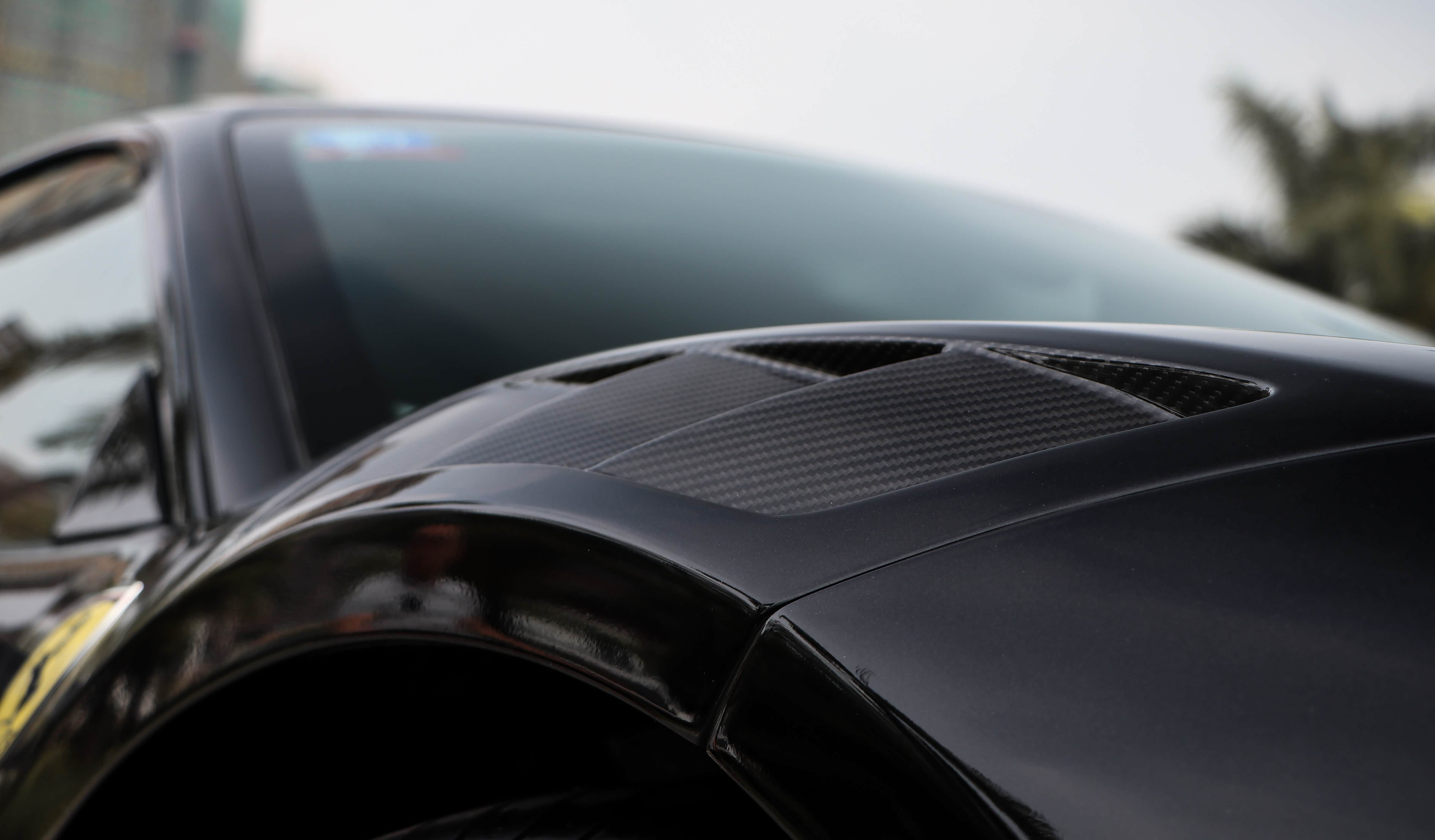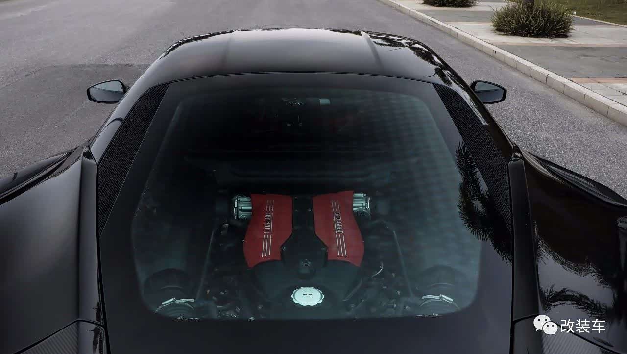 也许黑色的车漆会掩盖一些东西,让这辆488 GTB显得没那么高调。但其实车身的很多覆盖件均换成了重新设计的碳纤维产品。从车头位置来看,前杠和前备箱,都是采用了干碳的套件。只不过在安装到车上之前,改装店家已经给碳纤维配件喷上了原车漆,仅仅在前杠的扰流板和前备箱中间的V字处,保留了碳纤维原本的样子。