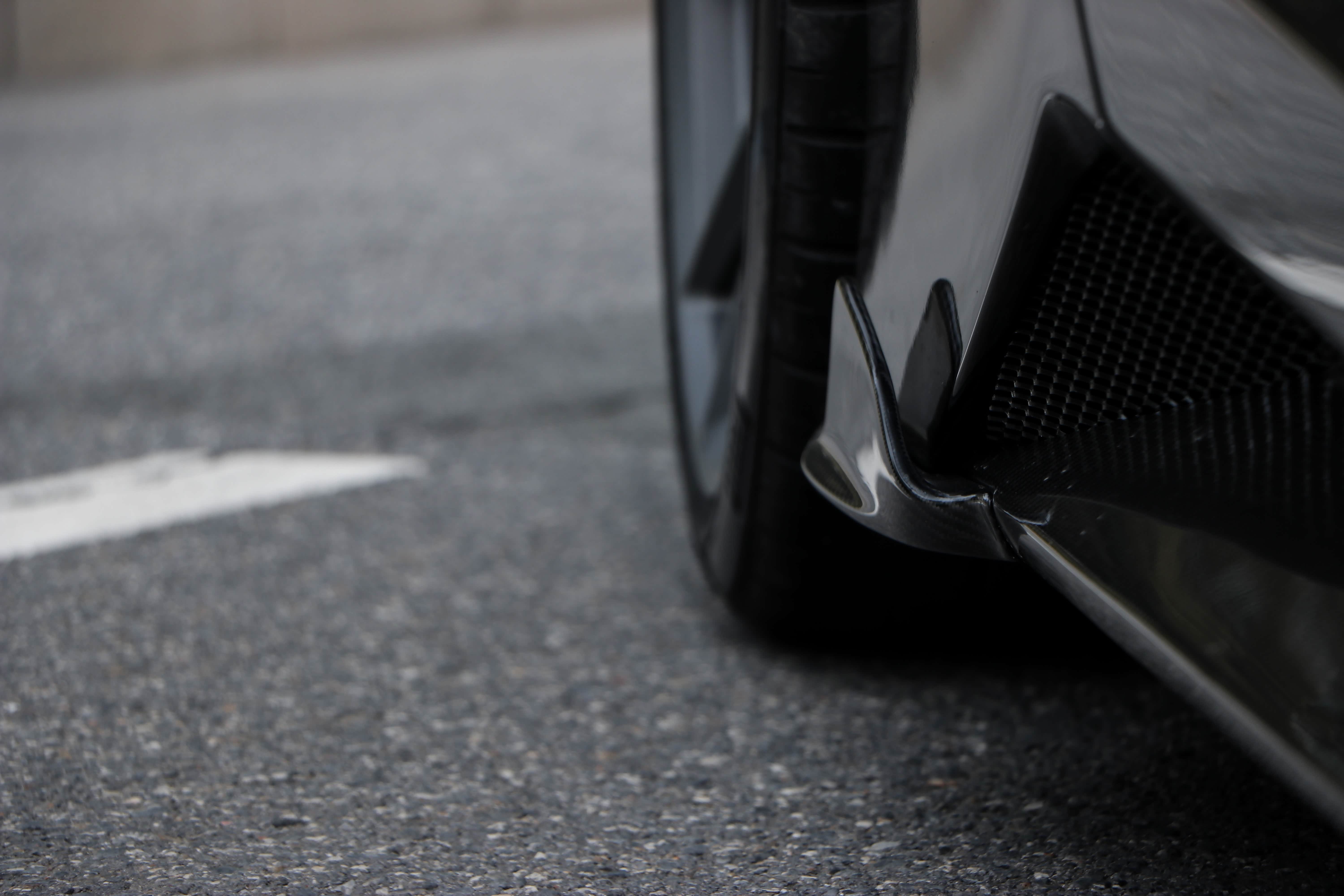 车侧部分,从前叶子板到后叶子板之间,也加装了定制的侧裙包围。不过这里的碳纤维配件却没有喷涂上原厂的黑色漆,而是保留了碳纤维本身拥有的质感。