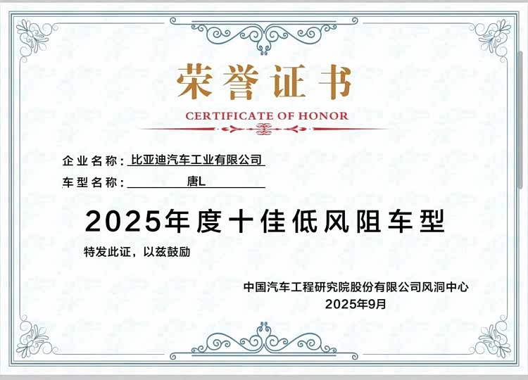 9月16日-17日,2025年中国汽车工程学会汽车空气动力学分会学术年会在重庆举行,会上正式发布年度十佳低风阻车型。其中,比亚迪汉L、 唐L(参数|询价)凭借卓越的空气动力学表现,分别以0.212Cd和0.262Cd的量产车实测风阻系数,双双荣获“年度十佳低风阻车型”奖,用实力证明了划时代旗舰车型的超低能耗以及出色的驾乘舒适性。
