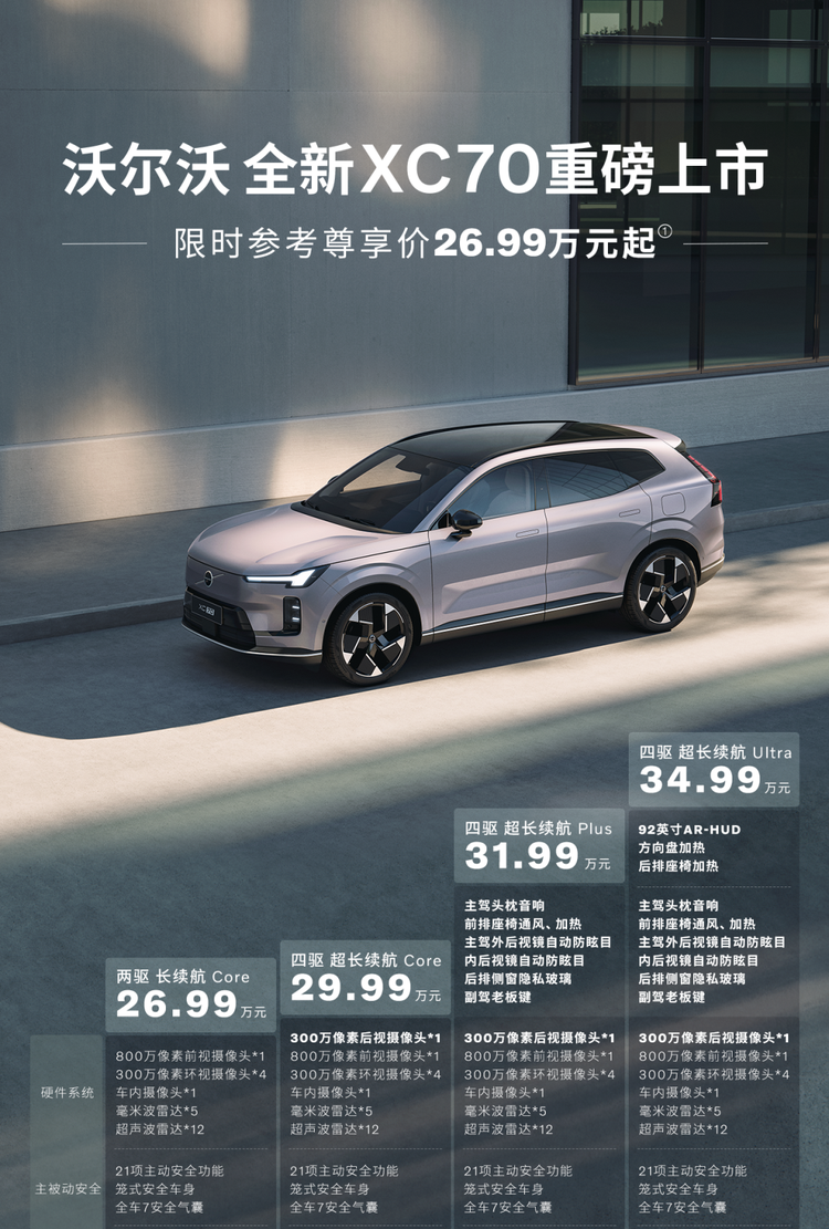 这一次,沃尔沃全新XC70 是给到了 4 款车型。限时的价格是 26.99 万到 34.99 万。这个价格相较于沃尔沃本品牌来讲,我个人觉得是它已经给出了巨大的让利。
