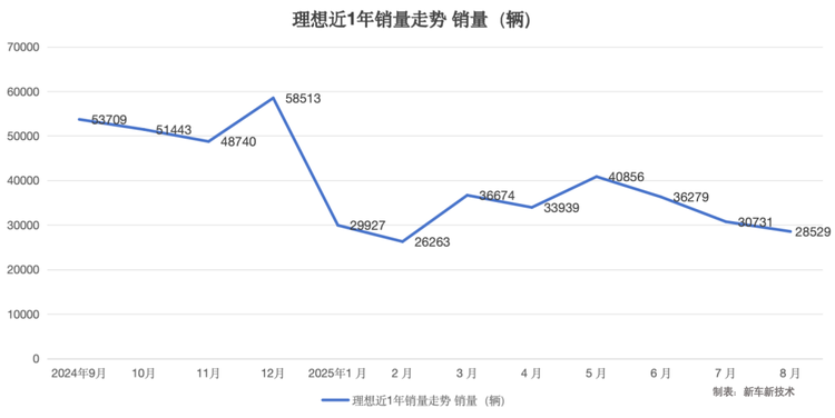 在一大批“类理想”的产品上市后,理想L系列产品的竞争力出现了走弱的情况,今年前8个月,理想汽车销量为26.3万辆,同比下降达8.6%。同时理想汽车的月销量出现了逐月下滑的情况,6月销量为3.6万辆,7月降至3.1万辆,8月进一步下跌至2.8万辆。