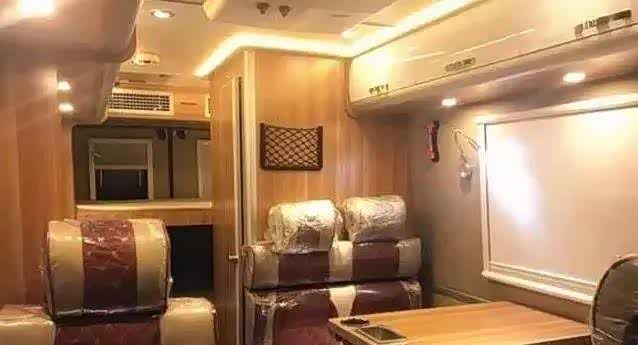 新车的整个车身已经超过了六米,这样的空间给整个车带来了很大的操作性,车的内部更是应有尽有,沙发厨房洗澡间,最关键的这部车有上下两张床,打开后尾门,还有一个非常宽敞的衣柜,内饰可以说是非常豪华了。