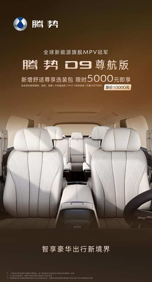 9月30日, 腾势D9(参数|询价)尊航版迎来舒适加码,DM-i两驱尊航型、四驱尊航型以及EV两驱尊航型加推“舒适尊享选装包”,限时5000元即享原价10000元的前排座椅通风、加热、按摩,方向盘加热,PM2.5绿净系统,负离子空气净化四大配置。不仅为用户带来更细腻的舒适体验,也进一步丰富了腾势D9尊航版的豪华价值感。