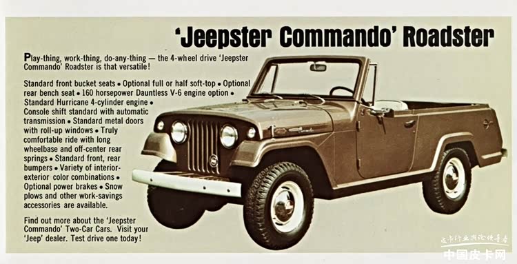为了满足不同用户的使用需求,Jeepster Commando推出了多种车身款式,包括皮卡、敞篷车、跑车和双门旅行车等版本。该系列车型在1966—1973年生产,共推出了两代产品,共计生产7.7万台左右。