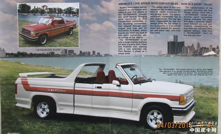 ASC公司基于普通Ranger皮卡打造了Skyranger,并将其改装成敞篷版,它配备了可拆卸的织物车顶、倾斜的防滚架和定制的Skyranger条纹。此外,它们还配备了一个奇特的尾翼,但这在一定程度上影响了Skyranger作为一款功能性皮卡的实用性。据悉,在1991年,这款皮卡仅生产了17台,目前被许多汽车爱好者所收藏。