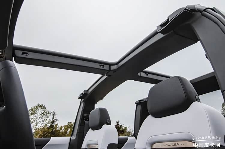 该车在整体设计上延续了此前悍马十分夸张、硬朗的造型,而整台车在结构上最大的亮点就是采用了三块透明的顶板作为车顶。在需要时,用户可以十分简单的拆下这三块顶板,并且能够完整地将其收纳在前备箱内,日常使用时具有着很高的灵活性。