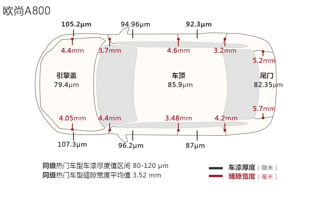 A800的外观工艺相比较更高价位的车型也毫不逊色,无论是外观的钣金缝隙,还是车漆的喷漆均匀度都很不错,不过车漆的厚度平均不足100微米则有点太薄了。