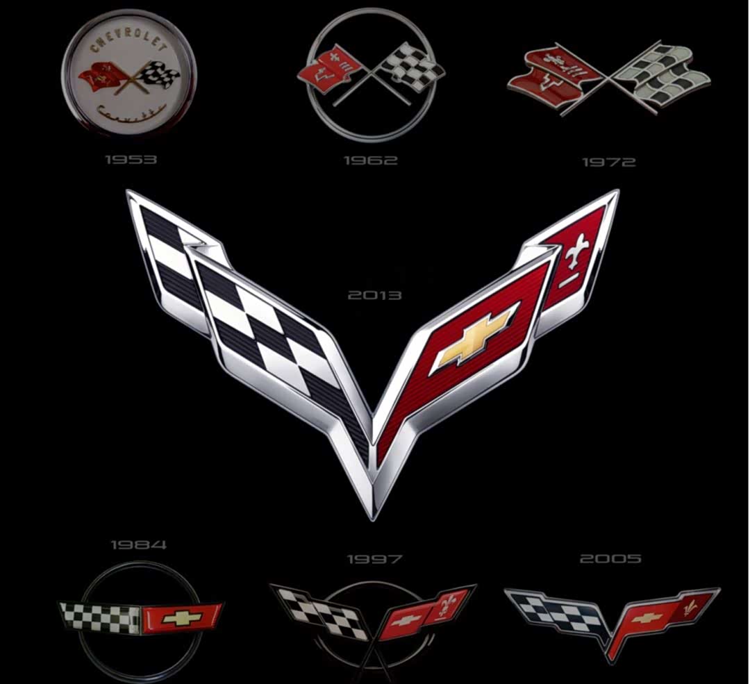 另外一个有趣的问题,按照科尔维特每一代的传统,车标都会进行一次演变,如果把前七代的车标排列出来,就能看出明显的时代特征。那么第八代的车标会变成什么样呢?