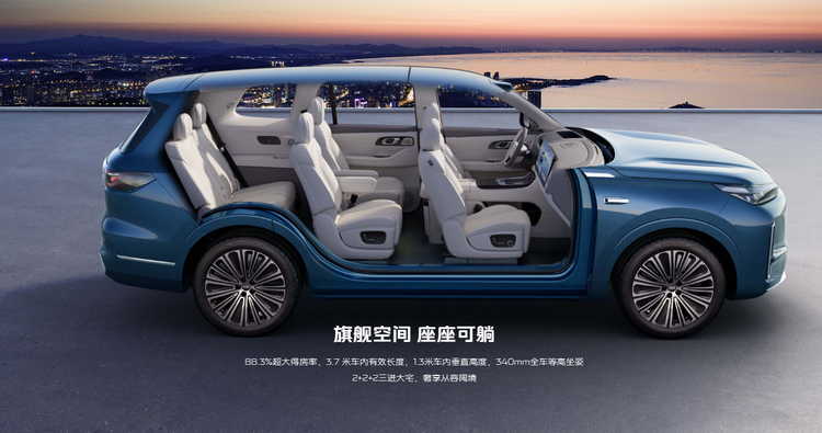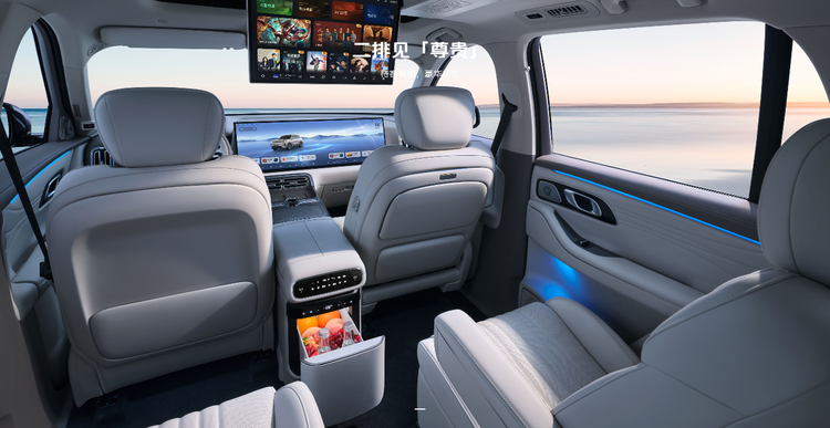 空间设计上,银河M9基于5205mm车长与3030mm轴距打造宽敞座舱,采用2+2+2三进式布局。前排主驾配备转向自适应侧翼支撑,副驾带一体式腿托,集成通风、加热和10点按摩功能;二排独立航空座椅搭配9.1L智能冷暖冰箱和17.3英寸高清娱乐屏,支持多屏联动;第三排支持150°最大躺倒角度,配合180mm宽纯平过道,确保全员舒适乘坐。后备箱在六座状态下容积达328L,二三排放倒后可扩展至2171L,轻松满足家庭储物需求。