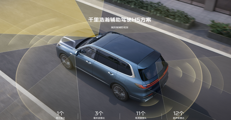 智能驾驶方面,银河M9采用千里浩瀚H5方案,实现“车位到车位”全场景城市无图NOA功能,覆盖全国道路。整车配备11颗高清摄像头和1颗激光雷达等硬件组合,标配40余项L2级安全功能。车身结构采用“星甲笼”设计,扭转刚度达32500N·m/deg,高强度钢占比超80%,搭配9安全气囊,构建全方位防护。神盾插混专用电池通过海水浸泡、20吨挤压等24项严苛测试,碰撞后30ms内自动切断高压电,安全标准远超国标。