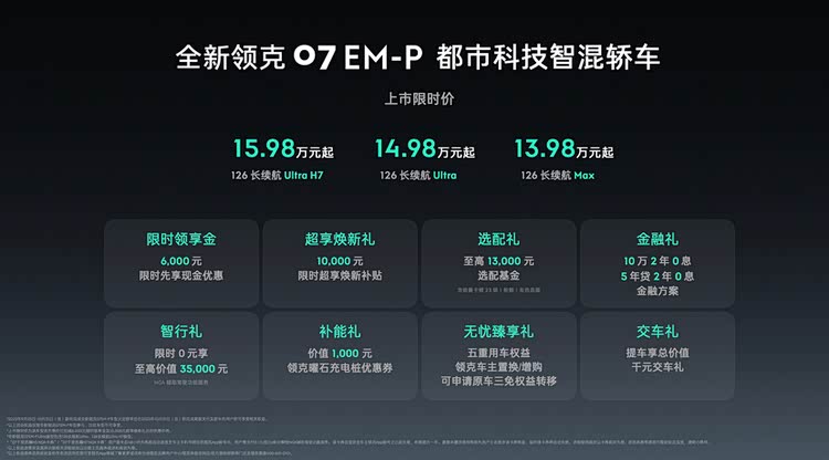 新款领克07 EM-P共计带来三款配置车型,指导价区间为15.58万-17.58万元。同时,官方还在上市期内带来多重优惠权益,其中限时领享金和超享焕新礼优惠补贴金额达到1.6万元,车辆限时价区间为13.98万-15.98万元。