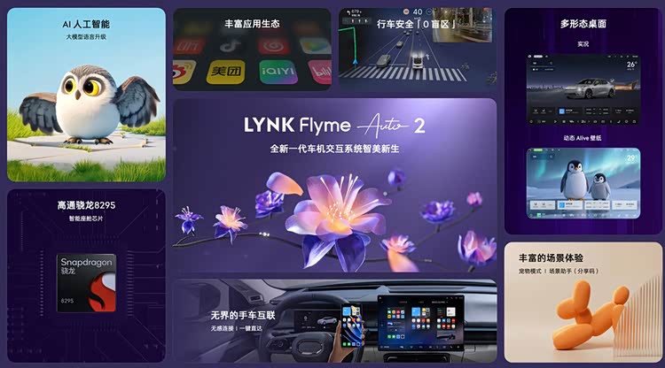 内置的Flyme Auto系统也已经进入了第二代,灵动桌面卡片与双小窗模式UI,使用体验较为清爽、便利。得益于高通骁龙8295芯片的算力加持,系统融合星睿AI大模型、阶跃多模态模型,可以在语音交互方面实现更好的拟人效果。Flyme Auto 2.0系统除了支持全部智能手机的屏幕流转,还支持PS5、Switch等外设有线接入,将座舱变为随行娱乐空间。