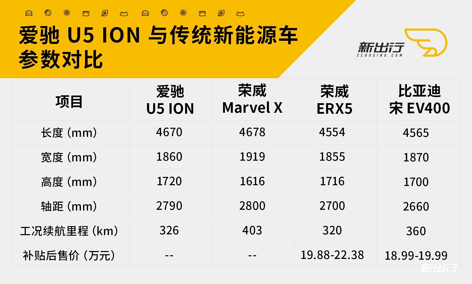 对比新势力造车,爱驰 U5 ION 在同级车型中尺寸最大