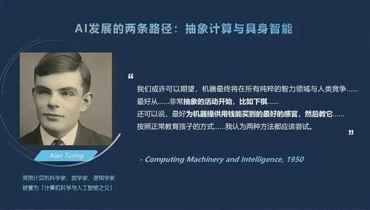 借用人工智能之父图灵的话来说,具备抽象计算能力的语言智能跟物理世界需要的具身智能本身就是AI领域中两条截然不同的路径。
