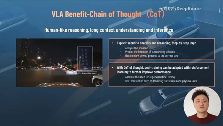 和基于预训练的大语言模型相比,VLA既拥有了大语言模型的常识,经强化学习后,又增加了基于思维链CoT的推理能力,可以帮助自动驾驶系统从物体感知走向场景理解。