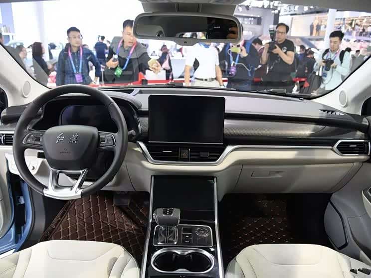 新车内饰采用了黑色与米色的撞色设计,营造出几分居家的直觉感受。中控区域实体按键很少,采用了上下双屏设计,与奥迪的设计手法有些类似,其中,悬浮式中控屏的尺寸略显夸张。方向盘采用了真皮包裹,并集成了多功能按键。除此之外,新车电子档把的设计也和奥迪有些相似。