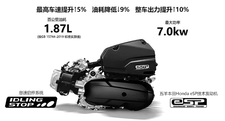在动力上该车搭载的是技术先进、性能稳定的ESP风冷引擎,其最大功率7KW,最大扭矩10N·m,官方工况油耗1.87升,最高设计时速90km/h,并有脉冲点火和怠速启停功能,实际性能和技术应用都属于同排量第一梯队。