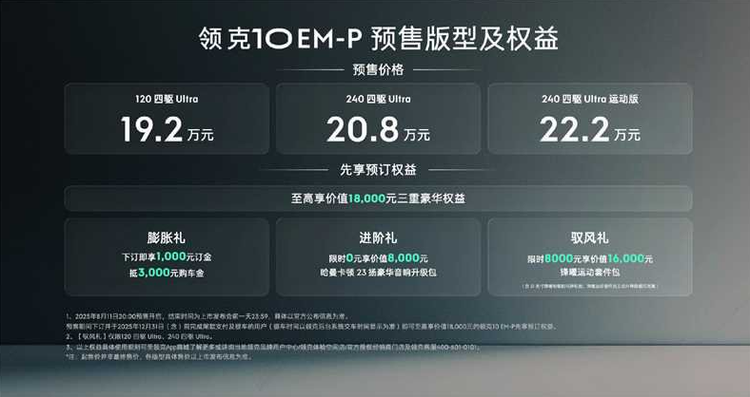 当下新能源汽车市场的竞争,已从单一的续航里程之争,演进至性能、智能、质感与舒适的全维度较量。消费者期待一台车,既能满足日常通勤的经济性,又能承载远行的安全感与驾驶乐趣。正是在这样多元且苛刻的需求背景下,领克品牌推出了其首款中大型插电混动轿车—— 领克10 EM-P(参数|询价),以“智能电混四驱轿车”为定位,全面回应市场的深度期待。如今,这款汇聚领先科技与匠心设计的车型已正式开启预售,并将于九月上市,旨在重新定义30万内混动轿车市场的价值标杆。
