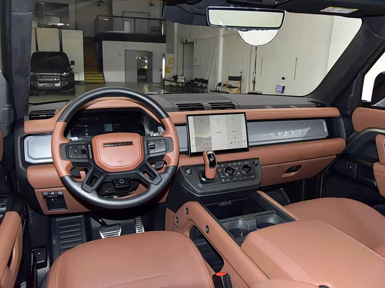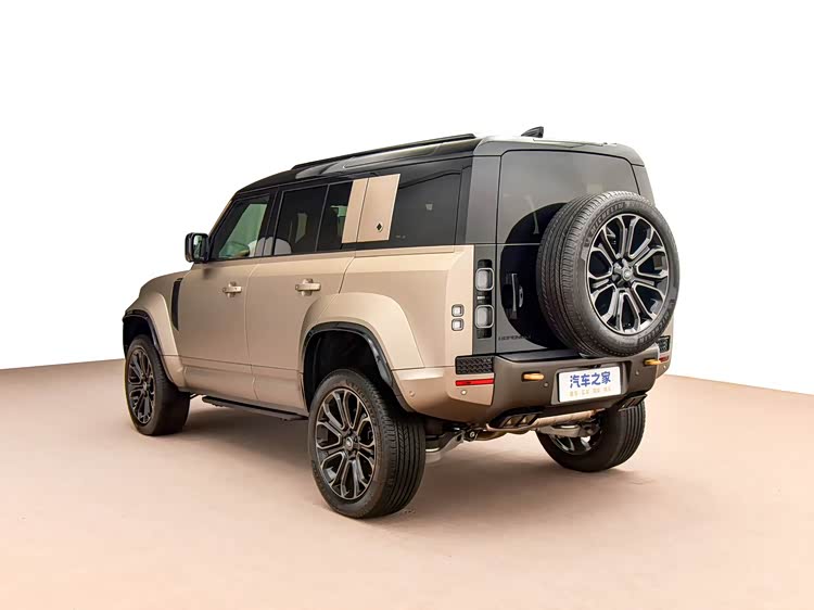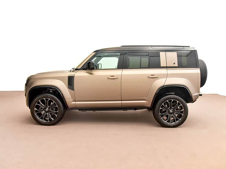 再来看车身侧面部分,车身侧面延续了卫士经典的方盒子轮廓,但通过68mm的宽体设计和28mm的车身高度提升,呈现出更魁梧的机械巨兽姿态。2105mm的车身宽度配合22英寸轻量化轮毂(可选20英寸全地形轮胎),让外扩的轮拱成为力量感的视觉锚点,缎面黑侧通风口与防刮板进一步强化硬派基因。323mm离地间隙与550mm车轮自由行程的6D智能底盘,使车身保持方正比例的同时,仍能从容应对岩石攀爬等极限场景。侧窗采用复古矩形设计,配以阿尔卑斯之光侧顶窗,在强化越野实用性的同时,延续了卫士75年的设计传承。OCTA版本独有瀚海蓝与砂岩金金属漆面,在阳光下呈现钻石切割般的折光效果,与磨砂材质形成的质感碰撞,诠释了现代豪华越野的美学新范式
