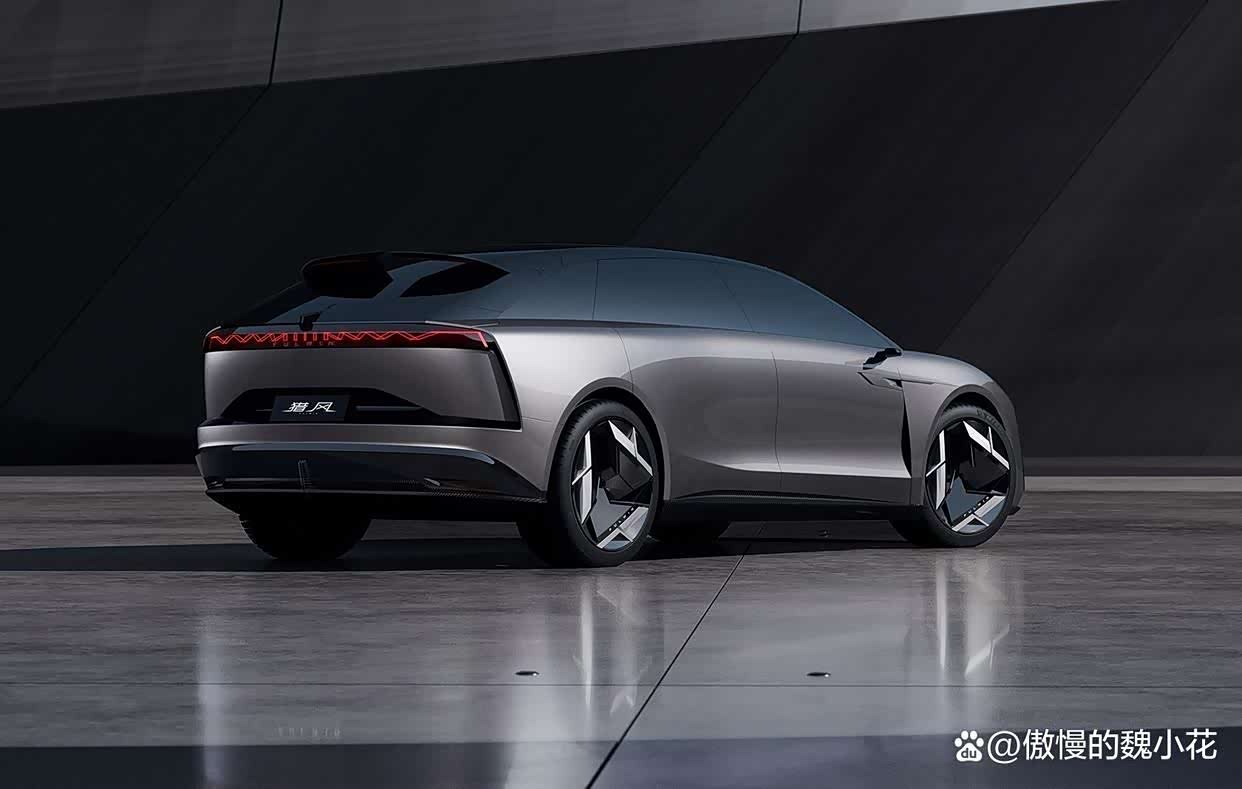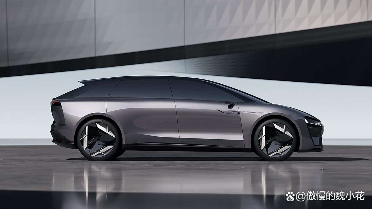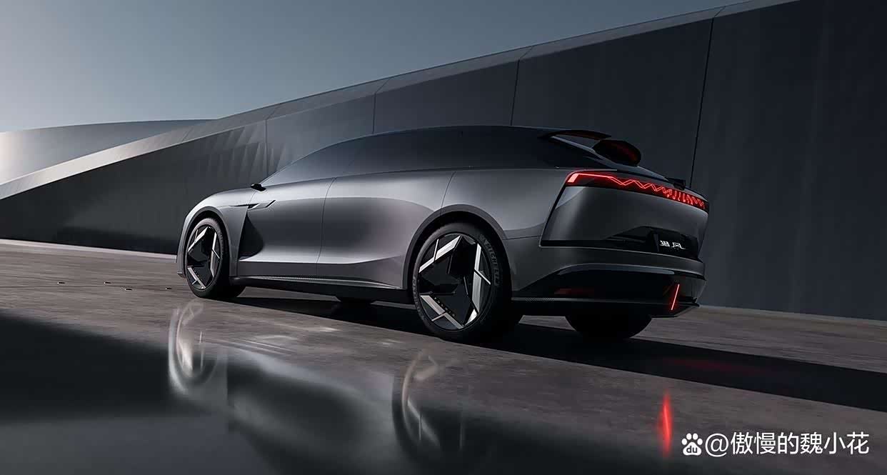 侧面,概念元素拉满,目前尚未看到这款车的门把手,但有消息称这款车将全部升级到电吸门,而后视镜也都采用了电子式的设计!前后双窄边状的轮眉以及几何形状的轮毂,兼顾了梦幻感与运动感!车顶部全部采用了黑色元素,所以远处看,悬浮效果非常明显!