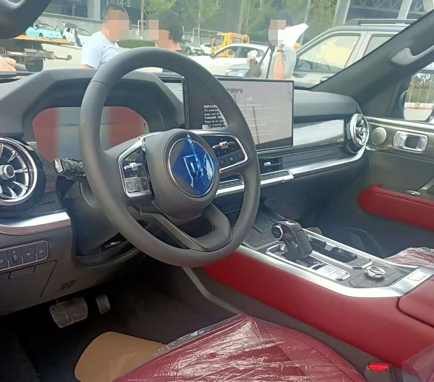 内饰方面,坦克400 Hi4-T延续了坦克500的布局风格,左侧是皮革材质包裹的三幅式多功能方向盘,中间还有部分镀铬装饰点缀,而且粗细适中的造型相信握感也会更加舒适。前方是12.3英寸的液晶仪表盘和中控处16.2英寸的超大悬浮式显示屏,同时新车还提供了HUD抬头显示和流媒体后视镜,形成了四屏设计,在空调出风口的下方还保留了部分物理按键,加上下方造型精致的挡把机构,很好的将科技感与操控感都展现了出来。用料方面,新车采用了大量的软性材质覆盖,并有镀铬装饰和缝线点缀,而且在A柱处还添加了硬派越野车专用的把手,豪华感十足。