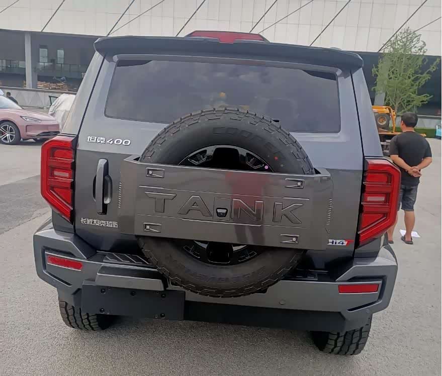 尾部坦克400 Hi4-T采用了方正硬气的造型,上方大尺寸扰流板下是传统越野车惯用的外佳式备胎,中间还添加了醒目的TANK标识。两侧尾灯组采用了竖向布局,内部E字形的光源就算在没有点亮的情况下也有着极强的辨识度,下方包围造型同样宽大厚实,展现出了极强蝗越野姿态。