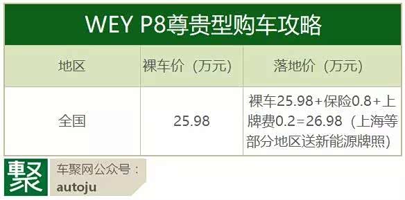 WEY P8已于近日上市,补贴后售价25.98-27.98万元。据车聚君了解,经销商无加价、捆绑装饰之类的行为。