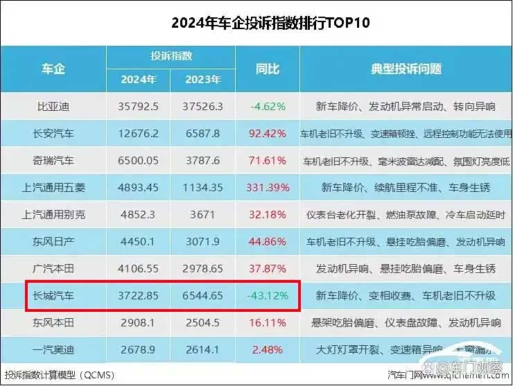 其中,长城汽车以43.12%的同比降幅成为投诉榜单中下滑幅度最大的车企,这一数据与魏建军强调的“用户满意度导向”形成呼应。
