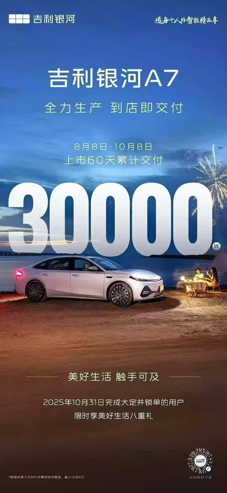 8月8日上市至10月8日,吉利银河A7以60天交付30000辆的战绩,在10万级电混家轿市场掀起“交付狂潮”。日均416台的交付效率,不仅刷新了同级市场纪录,更让这款车型成为家庭用户用订单投票的“硬核担当”。
