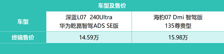 为了更好的进行对比,我们选择终端价格为14.59万的深蓝L07 240Ultra华为乾崑ADS SE版和终端售价为15.98万的海豹07 DM-i的135尊贵型两款车型进行对比。看看到底哪款车在这个价格才是更具有质价比的选择!