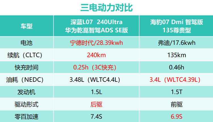 就以我们选择的两款车型来看,增程技术的深蓝L07不仅拥有更快的充电、更长的纯电续航,还有驾驶体验天然就更灵活的后驱架构。即使在一般被认为是增程技术缺点的油耗上,官标油耗和插混车型海豹07对比,也仅仅多了0.08L!如果是按照更新的标准、也更接近日常工况的WLTC的油耗数据对比,则仅仅比插混车型海豹07 DM-i多了几乎可以忽略的0.01L而已。所以,正如上文所说,对于普通的用户来说,如果没有大量的高速用车以及以油为主的用车环境,在体验上,几乎我们可以默认为,采用增程技术的深蓝L07要比采用插混技术的海豹07 DM-i在用户体验上表现更好!