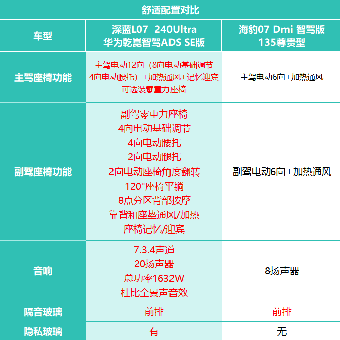 按照我们能找到的公开资料来看,深蓝L07在座舱舒适度方面的优势几乎是全方位的。包括但不限于整个前排的座椅功能和舒适度配置,而在音响配置方面,也是越级了一个规格。按理来说这样的音响配置,我们之前在20多万的很多车型上提到过,在十多万的价格里能给到这样的越级配置,再加上刚才我们所对比过的车机优势,最少在影音体验方面,我相信这样的诚意是每个用户都无法忽略的。所以问题就只剩下了一个,在类似的价格区间里,你会怎么选?