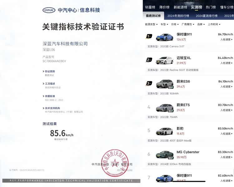 首先本次的测试成绩是很有底气的,中汽中心的测试报告可是业界比较权威,麋鹿测试的角度和桩桶细节都是符合国际测试标准的,数据真实可靠。本次测试也是一镜到底,为了打消外界担心“作假”的疑虑,这一点上就可以看出来深蓝L06确实很有底气。85.6km/h入桩速度,这可超越了多家平台权威的麋鹿测试成绩榜单。在大家前三榜单基本都是在84.7km/h-83.5km/h的情况下,深蓝L06已经可以做到85.6km/h入桩速度的优异成绩。