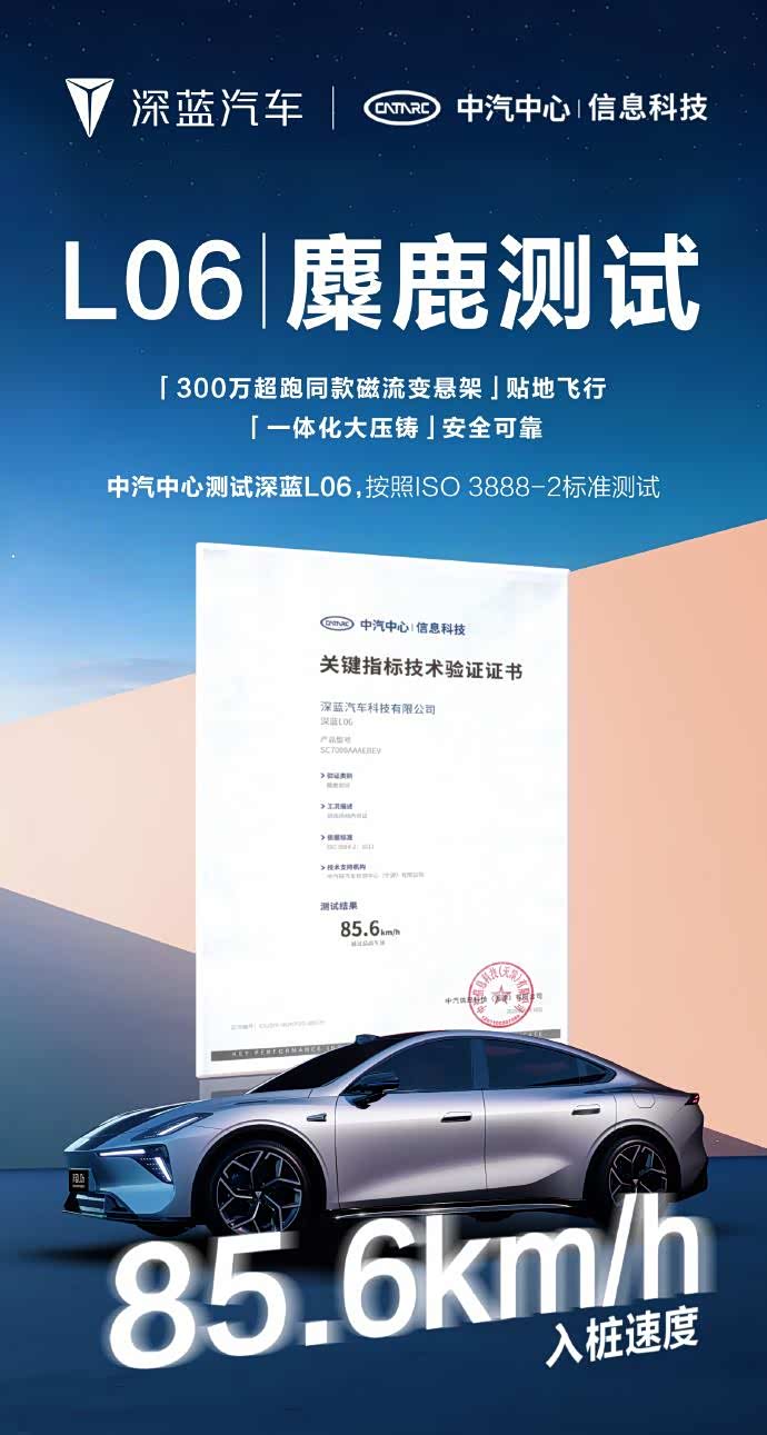 在不久前, 深蓝L06(参数|询价)亮相并且搭载百万豪车同款的磁流变悬架,这就引发了不小的热度。大家纷纷表示深蓝又开始整黑科技了,近期深蓝汽车联合中汽中心发起麋鹿测试挑战,为的就是证明这套磁流变悬架有多强。今天的内容就结合麋鹿测试成绩和日常用车痛点来为大家解读深蓝L06的黑科技。