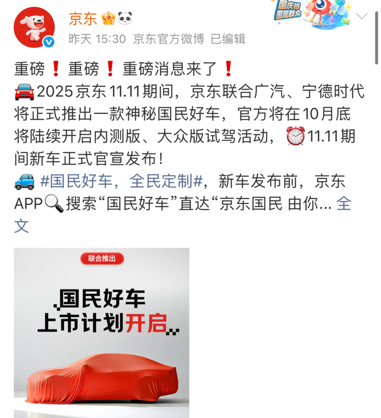 而此次联合广汽、宁德时代推新车,并计划在2025年双11开启京东独家销售,意味着京东正式切入新车销售环节,从“养车”到“卖车”,推动汽车消费全链条闭环。