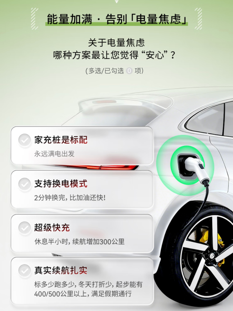 和蔚来一样,换电很可能成为新车的主要卖点。在京东发起的“国民好车,全民定制”H5互动中,“换电”选项被反复提及。