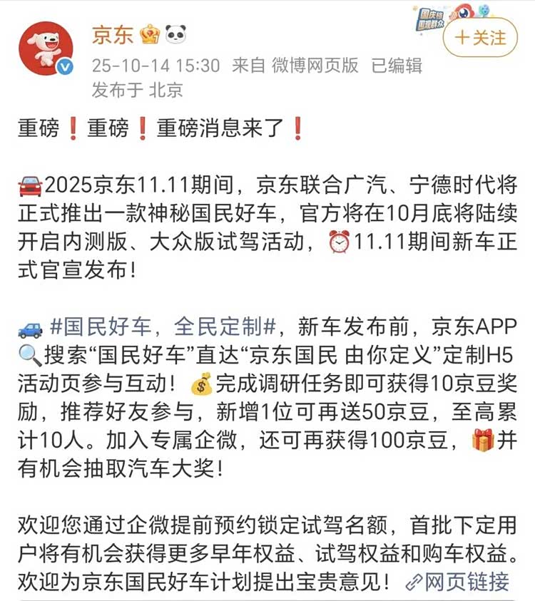 第三,现在正是双11购物节的备战期,京东顺势官宣要造 “国民好车” ,正好可以让用户给京东造车提提需求和建议,然后可以把收集到的用户对新车的想法和需求,反馈给造车的广汽,这样就能帮广汽更好地优化产品,做出更符合消费者的好车,同时又能给 “双十一” 引流,可以说是一举两得。